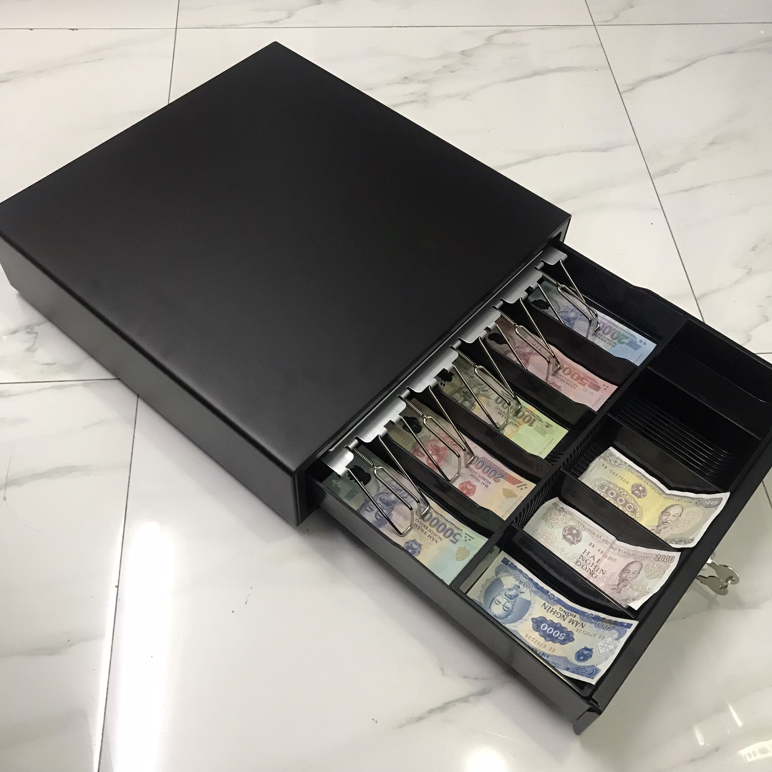 - Kích thước : 410(Ngang)X420(sâu)X110(cao) - Khay đựng : 7 ngăn tiền giấy có kẹp , 2 ngăn tiền giấy không kẹp , 2 ngăn nhỏ đựng tiền xu, hoặc các vật dụng khác như :