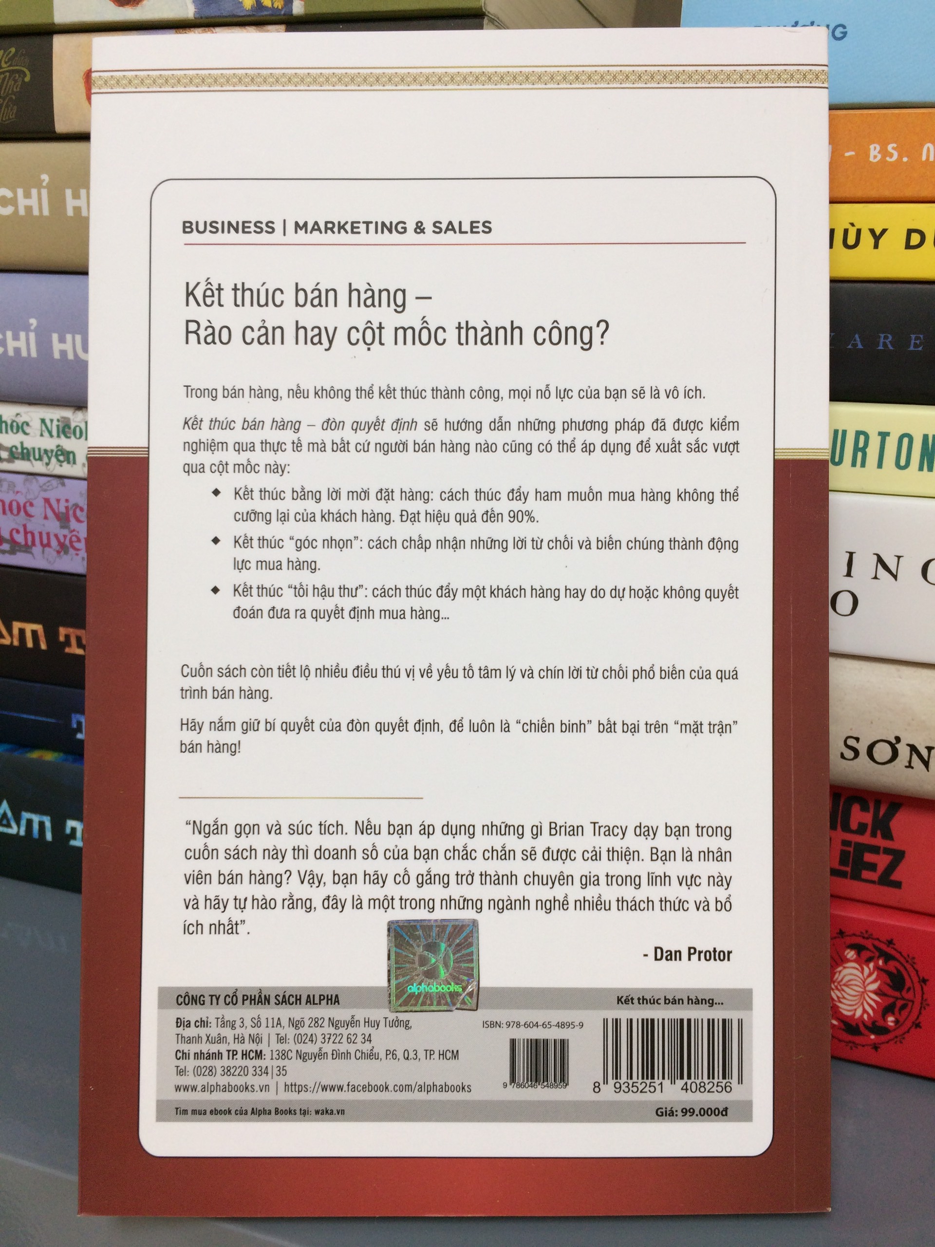 MÔ TẢ SẢN PHẨM Kết Thúc Bán Hàng – Đòn Quyết Định (Tái Bản 2018) Cuốn sách này mô tả được nỗi lo sợ của tất cả những người bán hàng ở mọi cấp độ và mọi thang bậc kinh nghiệm – đó là khi phải đối mặt với thời điểm quyết định. Những người nhiều kinh nghiệm hơn cảm thấy dễ dàng hơn và vượt qua các cung bậc cảm xúc nhanh hơn những người mới. Sự khác biệt là ở chỗ tập luyện liên tục và chuẩn bị kỹ lưỡng, thực hành nhiều và vượt qua nỗi sợ hãi. Trong bán hàng, nếu không kết thúc thành công, mọi nỗ lực của bạn sẽ là vô ích. Kết thúc bán hàng – đòn quyết định sẽ hướng dẫn những phương pháp đã được kiểm nghiệm qua thực tế mà bất cứ người bán hàng nào cũng có thể áp dụng để xuất sắc vượt qua cột mốc này: