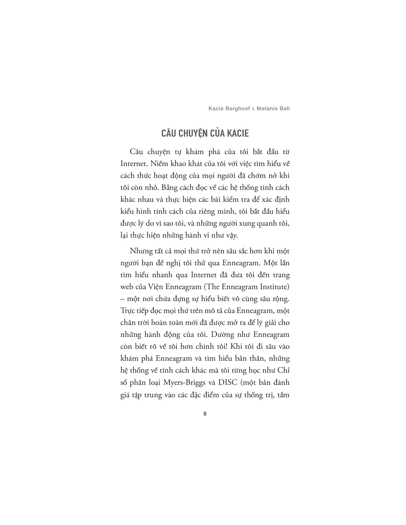 Khám Phá Biểu Đồ Thấu Cảm Giải mã tính cách – Đọc vị cảm xúc – Thấu hiểu nhân tâm – Tạo dựng quan hệ ‘Khám phá biểu đồ thấu cảm’ là cuốn sách giúp bạn hiểu sâu hơn về bản thân và từng bước tiến tới thành công trong cuộc sống. Cuốn sách khai thác mô hình Enneagram - mô hình tâm lý phổ biến, phân chia con người thành 9 kiểu hình tính cách khác nhau. Mỗi kiểu hình đại diện cho những đặc trưng và động lực riêng, giúp bạn nhận diện m.ình thuộc kiểu nào và cách mà nó ảnh hưởng đến thói quen, sự phát triển và tương tác của bạn trong công việc cũng như trong mối quan hệ. Biểu đồ thấu cảm là một công cụ cơ bản của Enneagram, giúp bạn nhìn thấu cảm xúc của m.ình và những người xung quanh. Thông qua việc hiểu rõ biểu đồ thấu cảm, bạn có thể nhận diện được những mặt có lợi và nhược điểm trong tính cách, quá trình tư duy, và cách phản ứng của bạn đối với các tình huống khác nhau. Nó không chỉ giúp bạn tôn vinh con người thật của m.ình, mà còn cung cấp các công cụ để quản lý cảm xúc hiệu quả và nâng cao mối quan hệ. Với những phân tích chi tiết về từng kiểu hình tính cách và cái nhìn tổng quan toàn diện, cuốn sách này là một hướng dẫn giúp bạn khám phá con người đích thực, quản lý cảm xúc hiệu quả, phát triển nghề nghiệp, và xây dựng sự thông cảm đối với những người xung quanh. Hãy cùng tìm hiểu Enneagram và tôn vinh con người thật của bạn để từng bước đạt được sự thành công trong thế giới thực. Về tác giả: Kacie Berghoef là giáo viên được ủy quyền của Viện Enneagram, người chủ trì hội thảo và nhà nghiên cứu. Bà đặc biệt tận tâm trong việc tìm kiếm các ứng dụng mới của Enneagram, từ việc phát triển các ứng dụng thực tế đến dạy các kỹ năng giao tiếp cho các chuyên gia và nhà quản lý trong ngành công nghiệp công nghệ. Melanie Bell là giáo viên được ủy quyền của Viện Enneagram và được IEA công nhận. Tốt nghiệp Đại học New Brunswick và Đại học Concordia, bà dẫn dắt các hội thảo và khóa học về Enneagram.