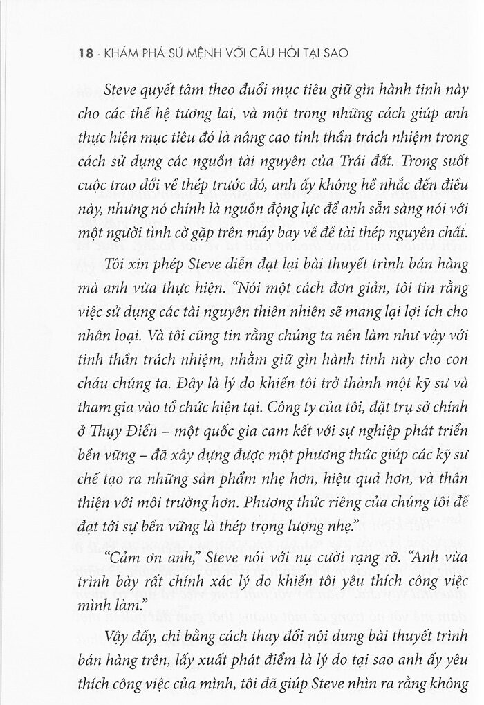 Sự mãn nguyện là một quyền lợi, chứ không phải đặc ân. Mỗi người trong chúng ta đều có quyền được cảm thấy mãn nguyện với công việc mình làm, có quyền được thức giấc trong tâm trạng hào hứng muốn đi làm, có quyền được thấy an toàn ở nơi làm việc và trở về nhà với cảm giác rằng chúng ta vừa góp sức cho một điều lớn lao hơn bản thân mình. Sự mãn nguyện không phải một trò chơi may rủi. Nó không chỉ dành cho một số ít người may mắn được nói rằng: “Tôi yêu công việc mình làm.” Nếu đang ở vị trí lãnh đạo, nhiệm vụ của bạn là tạo ra một môi trường trong đó đội ngũ do bạn phụ trách cảm thấy mình là một phần của điều gì đó lớn lao hơn bản thân họ. Nếu đang làm việc cho một tổ chức không khiến bạn cảm thấy hào hứng vào thời điểm khởi đầu và kết thúc mỗi ngày, bạn phải trở thành nhà lãnh đạo mà bản thân mình mong muốn có được. Bất kể giữ vị trí gì trong tổ chức, mỗi người chúng ta đều có ít nhất một đồng nghiệp, khách hàng, hoặc nhà cung cấp mà chúng ta chịu trách nhiệm cho cảm giác của họ khi làm việc với mình. Mục tiêu không phải là tập trung vào những gì đang cản đường bạn; mà là thực hiện từng bước đi mang lại tác động tích cực và lâu dài đối với mọi người xung quanh. Mỗi người trong chúng ta đều có trong mình hai chữ TẠI SAO, một mục đích, sứ mệnh, hay niềm tin thẳm sâu trong tâm hồn, đóng vai trò là mạch nguồn khơi dậy niềm đam mê và sự hứng khởi cho chúng ta. Có thể bạn chưa biết chữ TẠI SAO của mình là gì hay chưa biết cách diễn đạt nó thành lời. Nếu bạn muốn khám phá về chữ TẠI SAO của mình, thì cuốn sách này có thể giúp bạn làm điều đó. Chúng tôi tin rằng tất cả mọi người đều xứng đáng được sống như Steve: thức giấc trong tâm trạng háo hức muốn đi làm và tới cuối ngày, trở về nhà trong tâm trạng mãn nguyện với công việc mình làm. Khám phá sứ mệnh với câu hỏi tại sao gồm 7 chương. Các chương 1 và 2 nói về ý nghĩa của câu hỏi “tại sao” đối với mỗi người chúng ta. Ở chương 3, các tác giả hướng dẫn bạn đọc quy trình khám phá mục đích và sứ mệnh cho từng cá nhân. Các chương 4 và 5 là cẩm nang khám phá câu hỏi “tại sao” cho các đội nhóm và tổ chức. Chương 6 bàn về cách triển khai những sứ mệnh đã xác định được thành các yếu tố “như thế nào”. Chương 7 hướng dẫn độc giả cách chia sẻ về hai chữ “tại sao” của mình và áp dụng nó vào thực tế. Phần Phụ lục là những mẹo hay dành cho độc giả trong quá trình khám phá câu hỏi “tại sao” của bản thân hoặc của tập thể. Mục lục: Lời nói đầu Giới thiệu Chương 1: Bắt đầu với câu hỏi tại sao Chương 2 Khám phá hai chữ “tại sao” của bạn Chương 3 Quy trình khám phá câu hỏi “tại sao” cho cá nhân Chương 4 Quy trình khám phá câu hỏi “tại sao” cho tập thể Phần 1: Phương pháp Bộ lạc Chương 5 Quy trình khám phá câu hỏi “tại sao” cho tập thể Phần 2: Giao tiếp với bộ lạc Chương 6 Diễn đạt các yếu tố “như thế nào” Chương 7 Khẳng định lập trường Phụ lục 1 Những câu hỏi thường gặp Phụ lục 2 Các mẹo hay cho cộng sự tham gia vào quy trình khám phá câu hỏi “tại sao” dành cho cá nhân Phụ lục 3 Mẹo hay cho người điều hành quy trình khám phá câu hỏi “tại sao” dành cho bộ lạc Thông tin tác giả: Simon Sinek là giáo viên và diễn giả truyền cảm hứng nổi tiếng. Bài diễn thuyết đầu tiên của ông trên TED talk, Start With Why (Bắt đầu với câu hỏi tại sao) là video thu hút nhiều lượt xem thứ ba trong lịch sử của hội thảo này. Peter Docker là nhà cố vấn và huấn luyện viên về thuật lãnh đạo. David Mead từng cố vấn cho hơn 80 doanh nghiệp đến từ nhiều lĩnh vực khác nhau. Ông hiện là người đồng dẫn chương trình của podcast Start With Why (Bắt đầu với câu hỏi tại sao). Trích đoạn: Cơ hội không phải là tìm kiếm người bạn đồng hành hoàn hảo cho bản thân chúng ta. Cơ hội là kiến tạo người bạn đồng hành hoàn hảo cho nhau. Khám phá hai chữ “tại sao” của bạn Khi bắt đầu đi làm, bạn gặp phải rất nhiều khó khăn: Thức dậy vào buổi sáng, đi làm, lo ứng phó với sếp (hoặc nếu là sếp, bạn sẽ phải lo ứng phó với tất cả mọi người), kiếm tiền (lý tưởng nhất là thu nhập của năm sau cao hơn năm trước), về nhà, quản lý đời sống cá nhân, lên giường, thức dậy, lặp lại ngày hôm trước. Quả là mỗi ngày có rất nhiều thứ phải xử lý. Vậy tại sao lại phải làm phức tạp hóa vấn đề lên (và lãng phí thời gian) bằng cách cố gắng tìm hiểu lý do tại sao bạn làm điều mình đang làm? Song, đó không phải là phức tạp hóa vấn đề; nó rất đơn giản. Trên cương vị là độc giả của cuốn sách này, dù bạn là doanh nhân, nhân viên, người đứng đầu một nhóm hoặc một bộ phận, hay bạn muốn giúp cả tổ chức của mình tìm hiểu về hai chữ TẠI SAO, thì việc khám ph