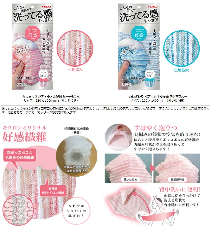 Khăn tắm kỳ lưng cao cấp Kikulon Azawari THÔNG TIN SẢN PHẨM Xuất xứ: Nhật Bản - Màu sắc: • 20155 màu hồng | Kích thước: rộng 23 x dài 100cm • 20156 màu