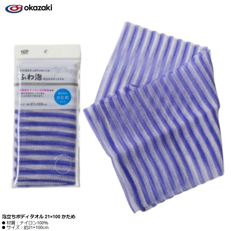Khăn tắm tạo bọt mịn Okazaki 21x100cm THÔNG TIN SẢN PHẨM Xuất xứ: Nhật Bản - Màu sắc: Hồng | Tím - Kích thước:21×100cm - Chất liệu:100% Polyester cao cấp với khả năng chịu được