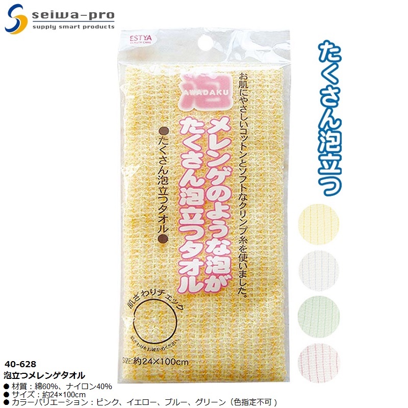 Khăn tắm tạo bọt Seiwa-pro meringue 24x100cm THÔNG TIN SẢN PHẨM Xuất xứ: Nhật Bản - Màu sắc: Màu vàng | xám | xanh( giao ngẫu nhiên) - Kích thước: 255×125×15mm - Chất liệu:Nylon 40%,