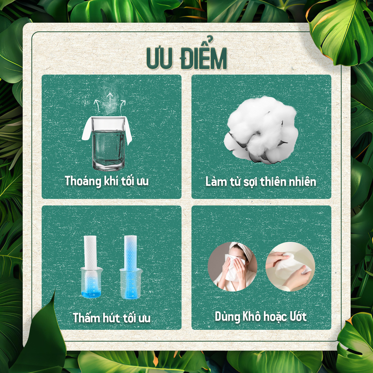 Ưu điểm nổi bật của sản phẩm - Lau sạch Khuẩn - Khăn rộng & co dãn - Chiết xuất Tre và Bông tự nhiên* - 0% Cồn, Hương và Paraben - Được kiểm nghiệm