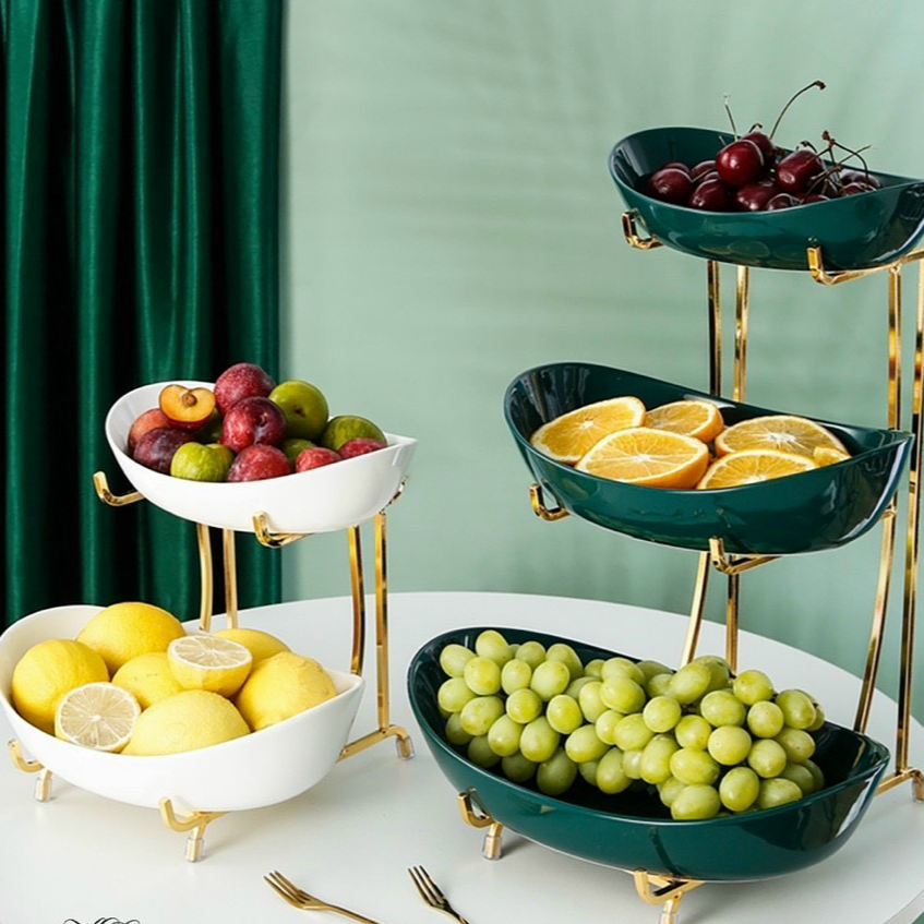Khay đựng hoa quả, bánh kẹo, mứt Tết 2 tầng, 3 tầng bằng gốm sứ kèm đế kim loại mạ vàng cao cấp.