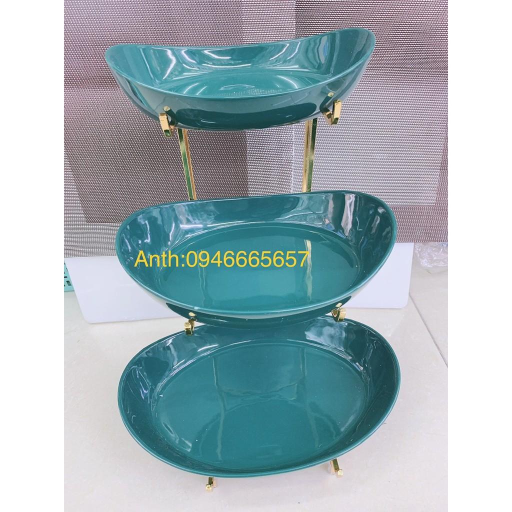 ✨KHAY ĐỰNG BÁNH KẸO HOA QUẢ SỨ MÀU XANH CỔ VỊT HÌNH BẦU DỤC KHUNG KIM LOẠI MẠ VÀNG 3 TẦNG