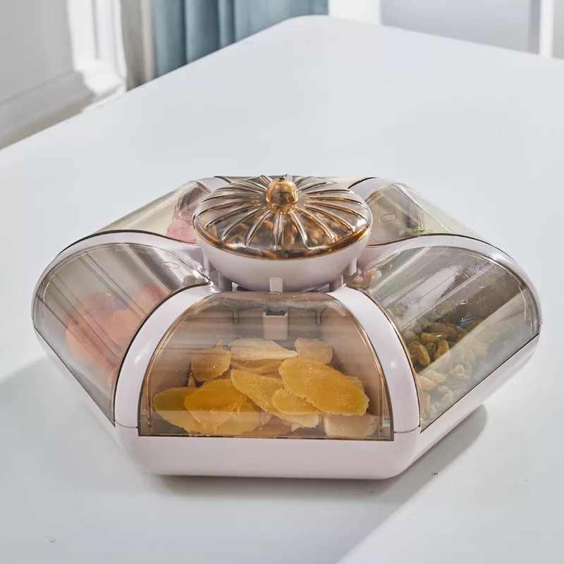 Khay đựng mứt kẹo mẫu mới được thiết kế với cách bung bông hoa 6 cánh. Thiết kế sang trọng tiện lợi. Với bông hoa 6 cánh và có nút nhấn chắc chắn. Thể tích lớn có thể sử dụng chất liệu nhựa an toàn cho người sử dụng, không bị ám mùi nhựa lên đồ ăn và thân thiện môi trường.