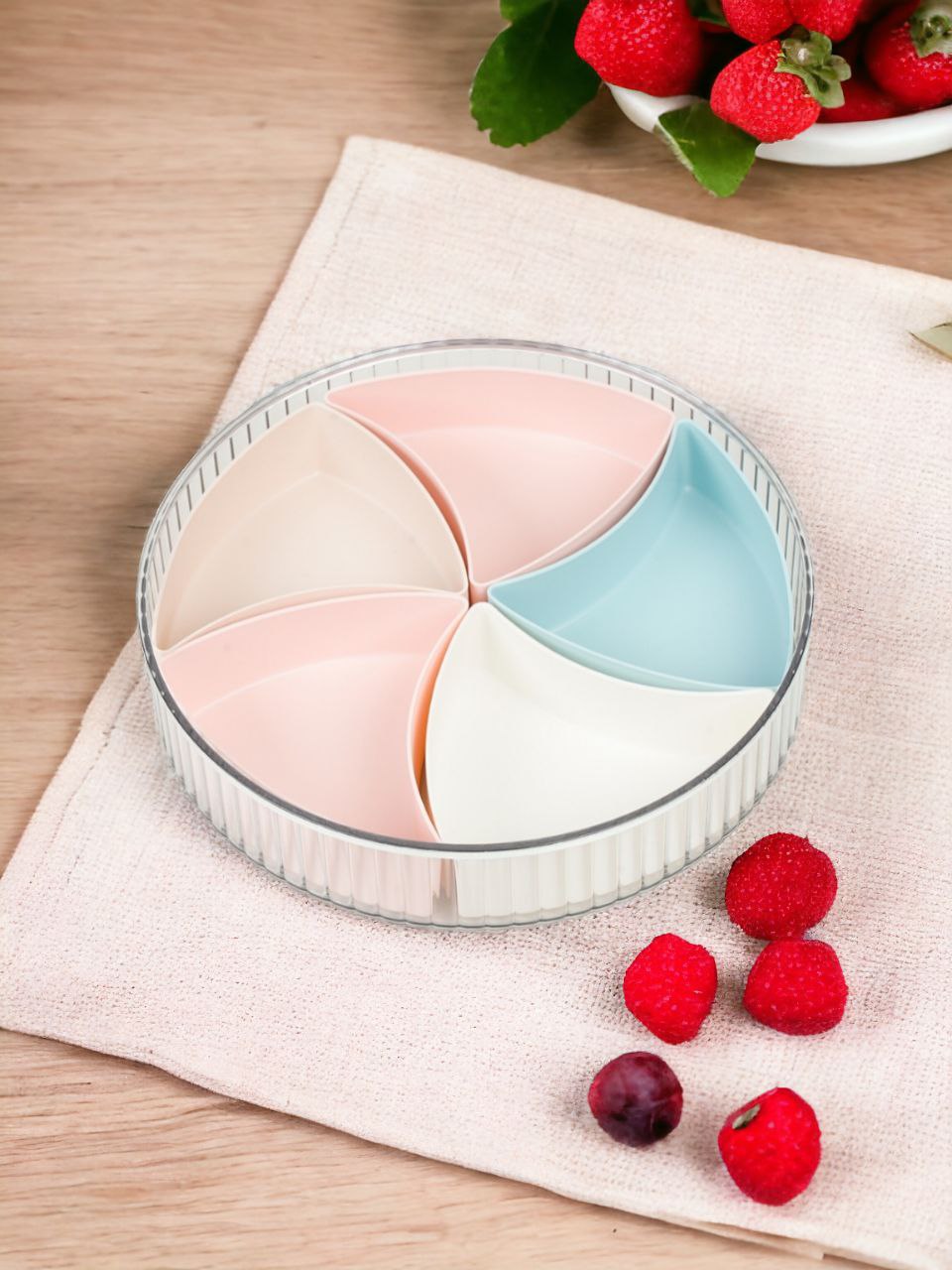 Khay mứt tết. Khay được thiết kế hình tròn biểu tượng trái đất hoàn vũ năm ngăn hình kim cương ngũ lộc