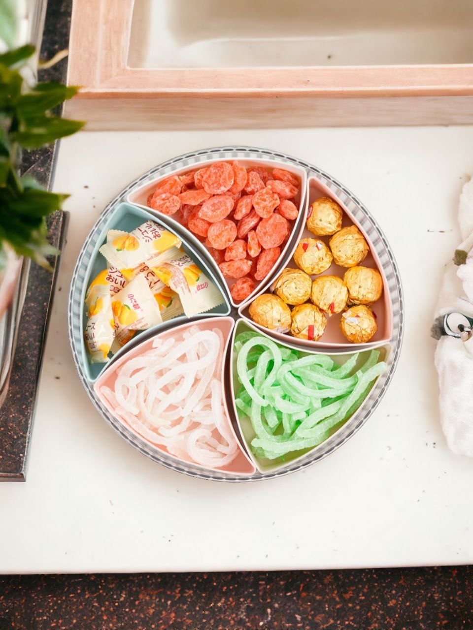 - Khay đựng mứt kẹo mẫu mới nhất năm nay 5 ngăn chính có nắp đậy