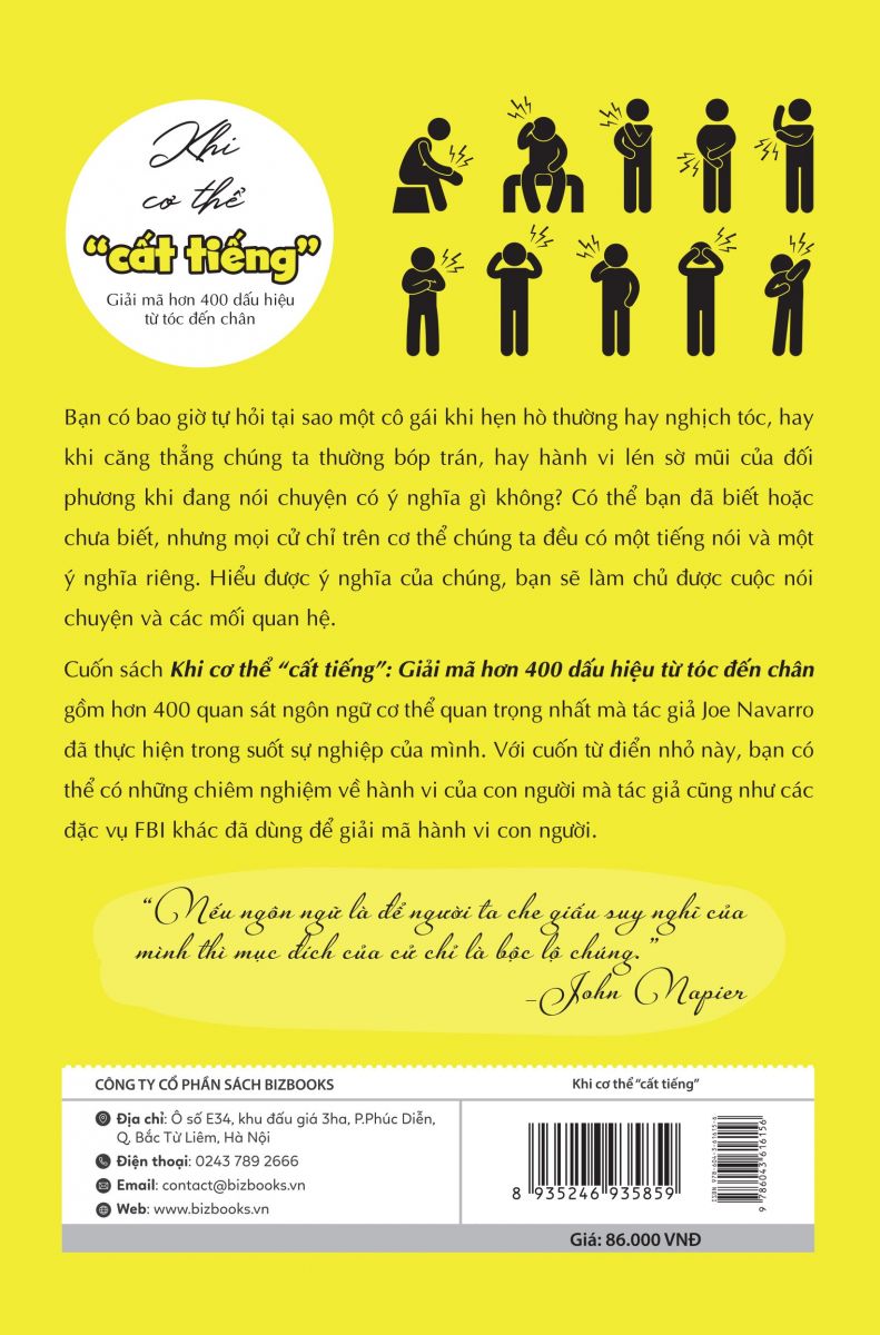 Bạn biết không? Có đôi khi người ta thường nói dối, nhưng vô tình điệu bộ của họ lại đang tiết lộ sự thật. Và đó là lý do trong bất kì mối quan hệ nào chúng ta cũng cần phải biết “nắm bắt” ý nghĩ của người khác, điều này nghe có vẻ khó nhưng hoàn toàn có thể làm được. Đặc biệt khi bạn là một người làm kinh doanh, thường xuyên phải gặp đối tác hay xây dựng các mối quan hệ thì việc biết đối phương có “mưu đồ” gì hay không là một vấn đề rất quan trọng để có thể “tuỳ cơ ứng biến”. Để bất kỳ ai cũng trở nên thật tinh tường nên cuốn sách Khi cơ thể “cất tiếng” đã ra đời và được săn đón vô cùng rộng rãi bởi sự thú vị và diệu kỳ mà nó mang lại. Tác giả đã sắp xếp theo các vùng cơ thể đi từ đầu xuống chân – Gồm hơn 400 quan sát ngôn ngữ cơ thể quan trọng nhất mà ông cùng các đặc vụ FBI khác đã dùng để giải mã hành vi con người trong suốt sự nghiệp của mình.