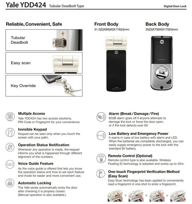 Thông số kỹ thuật khóa điện tử Yale YDD424