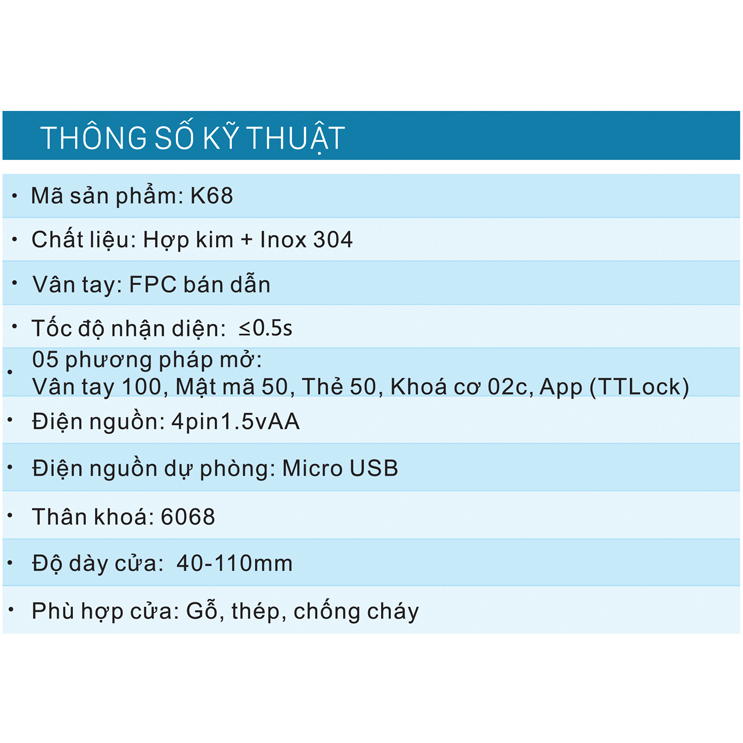 THÔNG SỐ KỸ THUẬT: Kích thước khóa: 76x185mm Nguồn cung cấp: Pin sạc Lithium 3,7V - 800 mah Nguồn điện khẩn cấp: 5V-1A, Micro USB Dây cáp sạc: Có Độ dày cửa: 30~55 mm Độ