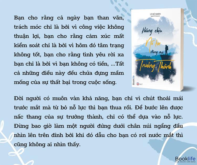 Mua tại TiktokMỗi người đều có một cái “kén” trói buộc mình, trước khi phá kén, đều sống cuộc đời giống như con sâu vậy. Cái kén này có thể là gia cảnh nghèo khó, là cuộc sống đơn điệu mỗi ngày, là những tiếng cãi lộn không điểm dừng của bố mẹ, là cuộc hôn nhân thất bại, là công việc không chút khởi sắc, là căn nhà có thể mãi mãi cũng không mua nổ Trong chiếc kén như thế này, nếu như chúng ta ngủ nướng, có thể chúng ta không hề cảm thấy khó chịu là bao, nhưng một khi chúng ta bắt đầu suy nghĩ thì sẽ lập tức cảm nhận được sự đau khổ khi bị trói buộc. Nó vây hãm chúng ta, khiến chúng ta không thể cử động, vì thế trong cuộc sống có vô số lần chúng ta rơi vào bế tắc, chỉ biết thở dài mà không biết tương lai rồi sẽ ra sao. Làm thế nào chúng ta mới có thể phá kén mà giương cánh bay cao, thật sự trải nghiệm được cảm giác tự do bay lượn giữa đất trời bao la? Không chịu nỗ lực đừng mơ trưởng thành sẽ giúp bạn giải đáp câu hỏi ấy. Chúng ta cần phải khắc phục ảnh hưởng của ngoại cảnh, khắc phục sự do dự, lười biếng, băn khoăn và lo lắng. Bất kể thế giới bên ngoài có biến hóa như thế nào, người có tinh thần tự thúc đẩy, cuối cùng đều sẽ nghe theo trái tim mình, cho dù đối mặt với tình trạng biến hóa nhanh chóng thế nào đi chăng nữa, rơi vào hoàn cảnh khó khăn như thế nào chăng nữa, cũng sẽ âm thầm chịu đựng, một mình tiến về phía trước. Đời người có muôn vàn khả năng, bạn chỉ vì chút thoải mái trước mắt mà từ bỏ nỗ lực thì bạn thua rồi. Để bước lên được nấc thang của sự trưởng thành, chỉ có thể dựa vào nỗ lực. Đừng bao giờ làm một người đứng dưới chân núi ngẩng đầu nhìn lên trên đỉnh bởi khi đó dẫu cho bạn có rơi nước mắt thì cũng không ai nhìn thấy. Trưởng thành là không ngừng cố gắng, không ngừng nỗ lực, không ngừng kiên trì để vươn lên. Thông tin tác giả: Lý Hủ Nhiên là VVIP trên diễn đàn Zhihu, có hàng triệu fan hâm mộ. Tài khoản cá nhân “Hủ tiên sinh” được Notesandbox và Newrank đánh giá là “một trong mười tài khoản Wechat đáng giá nhất” trong lĩnh vực kỹ năng nơi công sở. Sáng tác rất nhiều tác phẩm hot có danh tiếng tốt, được chia sẻ trên tường của các tài khoản lớn như Nhật báo Nhân dân, Youshu, Duzhe, Master I