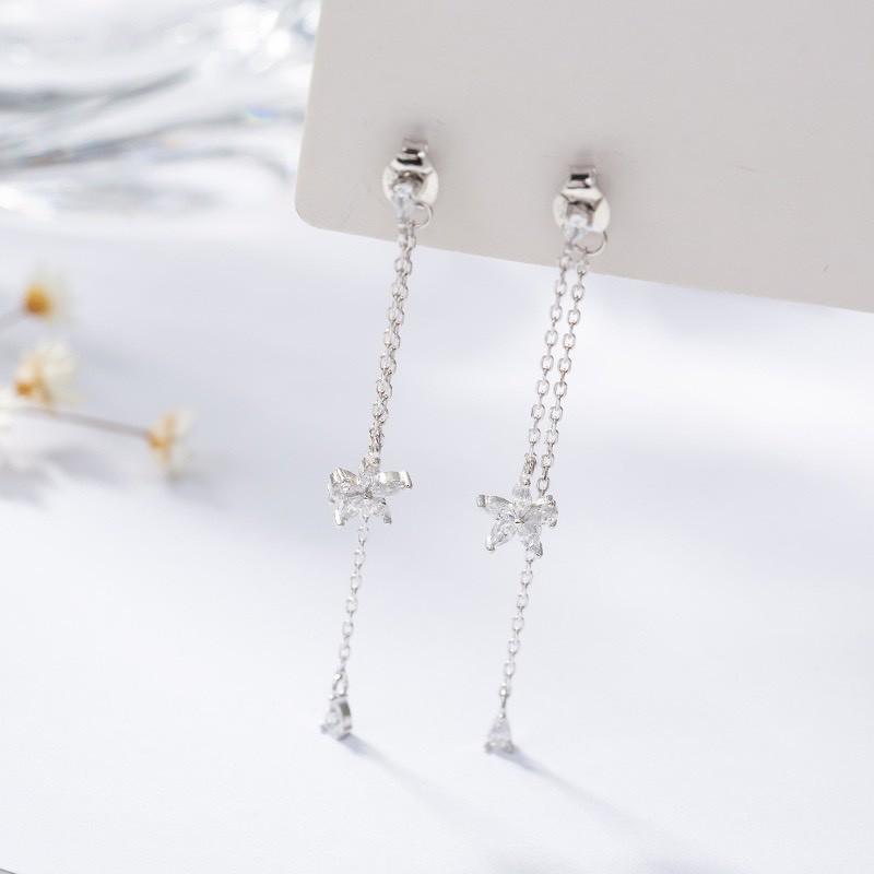 • Khuyên tai bạc 925 hoa 5 cánh thả xích duyên dáng thanh lịch tiểu thư Dế Bạc - K5675