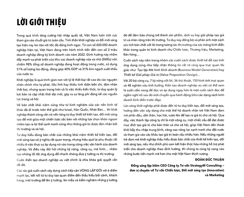 Dù bạn là lãnh đạo doanh nghiệp, doanh nhân truyền cảm hứng, nhà đổi mới tổ chức, nhà đầu tư tăng trưởng, tác nhân thay đổi ảnh hưởng xã hội hay sinh viên kinh doanh thì Kiến tạo doanh nghiệp ưu việt cũng là một cuốn cẩm nang hướng dẫn cung cấp cho bạn các công cụ, kỹ năng và tư duy mới để làm chủ sự mơ hồ và tạo ra giá trị từ những mơ hồ ấy. Kiến tạo doanh nghiệp ưu việt giới thiệu đến độc giả quy trình thiết kế vòng lặp đôi, một cách tiếp cận thực tiễn đối với việc tạo ra và phát triển giá trị thông qua việc sử dụng những thực tiễn chung và tổng hợp mà bất cứ ai cũng có thể học hỏi và ngay lập tức áp dụng vào tổ chức của mình. Bạn sẽ nhận được những lời khuyên hữu ích từ các nhà lãnh đạo tư tưởng như Steve Blank về đổi mới, Alex Osterwalder về các mô hình kinh doanh, Nancy Duarte về kể chuyện và Rob Fitzpatrick về đặt câu hỏi và rất nhiều người khác. Với những hướng dẫn trực quan chi tiết về 20 công cụ chiến lược và 48 nghiên cứu tình huống cùng với những ví dụ thực tế từ các doanh nghiệp lớn như ING Bank, Audi, Autodeck và Dịch vụ Tài chính Toyota đến các doanh nghiệp khởi nghiệp nhỏ, các vườn ươm khởi nghiệp cũng như các tổ chức xã hội, Kiến tạo doanh nghiệp ưu việt sẽ là cuốn sách hướng dẫn dễ hiểu và thực tế về cách kiến tạo và duy trì đổi mới đồng thời coi đó là kim chỉ nam cho doanh nghiệp của bạn .