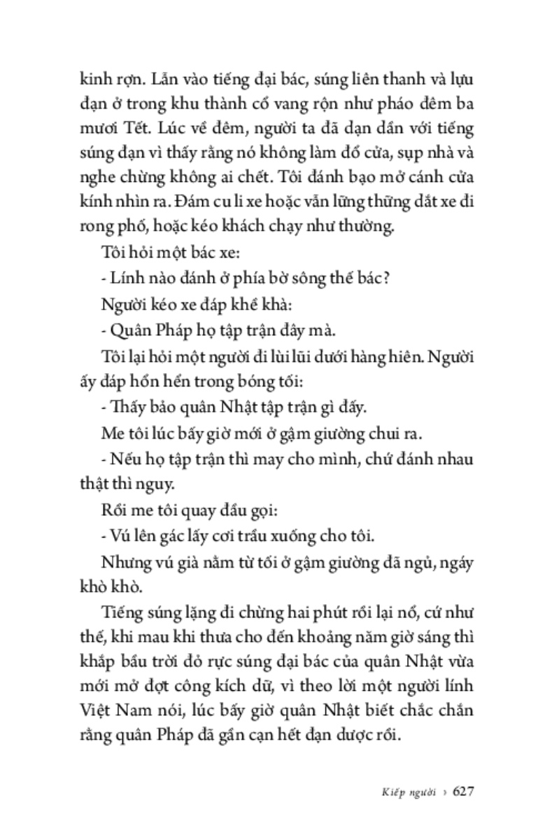 Kiếp Người được chia làm 5 phần: Tuổi thơ - Những người khốn khổ - Văn sĩ - Kiếp cầm ca - Khí phách anh hùng - Những kẻ chán chường