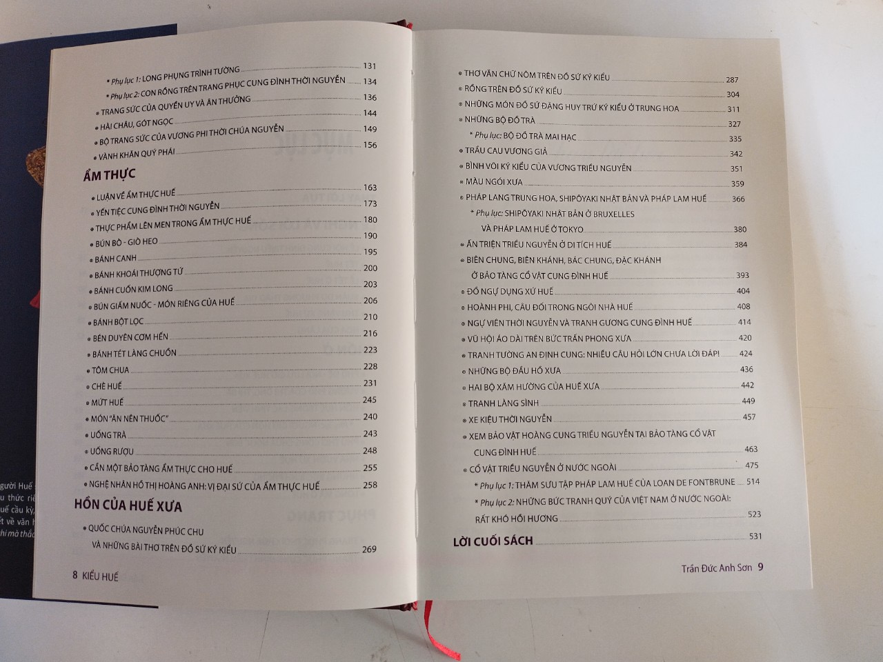 - Phụ lục 2: Con rồng trên trang phục cung đình thời Nguyễn Trang sức của quyền uy và ân thưởng Hài châu, gót ngọc Bộ trang sức của vương phi thời chúa Nguyễn Vành khăn quý phái ẨM THỰC Luận về ẩm thực Huế () Yến tiệc cung đình thời Nguyễn Thực phẩm lên men trong ẩm thực Huế () Những món “ăn nên thuốc” () Bún bò - giò heo Cháo bánh canh Bánh khoái Thượng Tứ Bánh cuốn Kim Long Bún giấm nuốc () Bánh bèo, bánh nậm () Bánh bột lọc () Cơm hến () Bánh tét làng Chuồn Tôm chua Chè Huế () Mứt Huế Uống trà Uống rượu Cần một bảo tàng ẩm thực cho Huế Nghệ nhân Hồ Thị Hoàng Anh: vị đại sứ của ẩm thực Huế HỒN CỦA HUẾ XƯA Quốc chúa Nguyễn Phúc Chu và những bài thơ trên đồ sứ ký kiểu Thơ văn chữ Nôm trên đồ sứ ký kiểu Những món đồ sứ Đặng Huy Trứ ký kiểu ở Trung Hoa Những bộ đồ trà