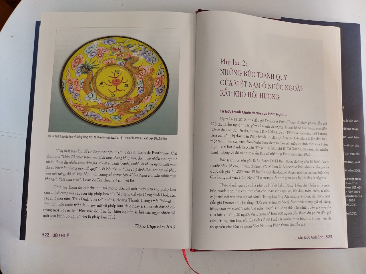- Phụ lục: Shipouyaki Nhật Bản ở Bruxelles và pháp lam Huế ở Tokyo Ấn triện triều Nguyễn ở di tích Huế Biên chung, biên khánh, bác chung, đặc khánh ở Bảo tàng CVCĐ Huế Đồ ngự dụng xứ Huế Hoành phi câu đối trong ngôi nhà Huế Ngự viên thời Nguyễn và tranh gương cung đình Huế Vũ hội áo dài trên bức trấn phong xưa Tranh tường An Định Cung: nhiều câu hỏi lớn chưa lời đáp! Những bộ đầu hồ xưa Hai bộ xăm hường ở Huế xưa Tranh làng Sình Xe kiệu thời Nguyễn Xem bảo vật hoàng cung triều Nguyễn tại Bảo tàng CVCĐ Huế Cổ vật triều Nguyễn ở nước ngoài (*)