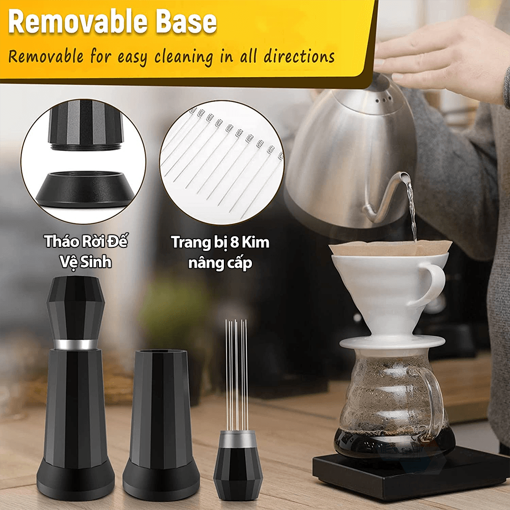 Kim đánh tơi bột cà phê WDT Một dụng cụ giúp ích cho việc pha chế các Espresso tuyệt vời, đạt chuẩn chất lượng nhanh chóng. Chống channeling Khi pha chế bằng máy pha cà phê Espresso, thông thường cà phê khi xay ra mịn sẽ làm vón cục, dẫn tới quá trình nén và chiết xuất họng pha sẽ không đồng đều, không đủ áp, xuất hiện hiện tượng channeling khi pha. Kim đánh tơi bột cà phê WDT sẽ rất hữu ích giúp cho việc phân bổ đồng đều cà phê bột bên trong, chống bị bón cục. Với thiết kế tám khi khuấy, là phiên bản nâng cấp của các WDT trước đây, giúp người dùng đánh tơi dễ hơn, và giảm thiểu thời gian đơn giản hơn. Sở hữu đường kính kim chỉ còn 0.4mm với chất liệu SS304 bền bỉ. Phiên bản cũ đã bị đánh bại hoàn toàn với đường kính này. Thiết kế có thể tháo rời toàn bộ các bộ phận riêng biệt. Vệ sinh Kim đánh tơi bột cà phê WDT dễ dàng mà đơn giản. Đặc biệt là phần Đế, giúp việc làm sạch bột cà phê lâu ngày quá tiện lợi