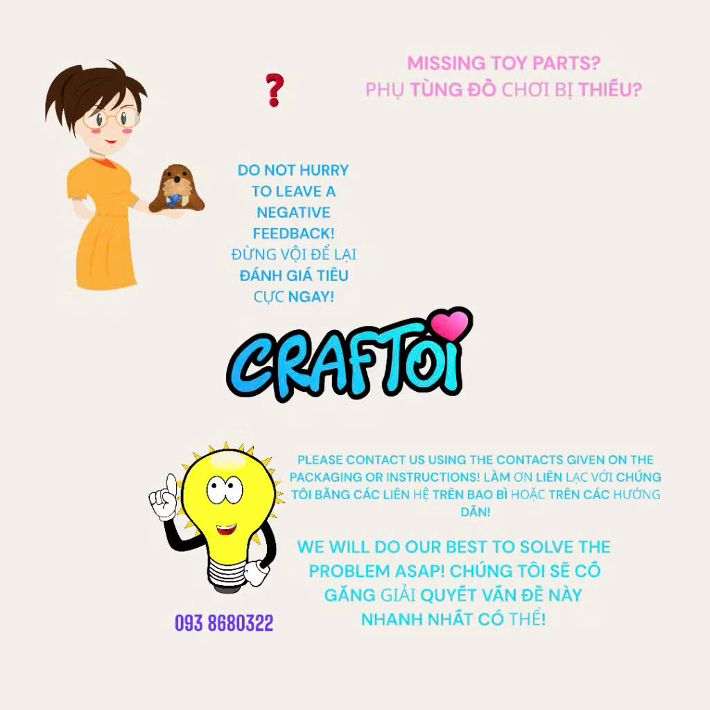 Mua tại Tiktok*** Thông tin sản phẩm Mã hàng: Unicorn Mrs.Rainbow Tuổi sử dụng: 5+ Kích thước: 16x16 cm Một bộ bao gồm: 17 bộ phận làm bằng vải nỉ Bông nhồi Chỉ may và bông nhồi Kim an toàn làm bằng nhựa Bảo quản: trong phòng khô thoáng. Thành phần: polyester, nhựa. Năm sản xuất: 2023 Độ bền của sản phẩm: sử dụng không giới hạn!!! Xuất xứ VIỆT NAM !!!!!!! Được Trung Tâm Giám Định Và Chứng Nhận Hợp Chuẩn Hợp Quy VietCert đánh giá chứng nhận phù hợp Quy chuẩn QCVN 3:2019/BKHCN của Bộ Khoa Học - Công nghệ. Đồ chơi sáng tạo từ nhồi bông. Hãy bắt đầu may con búp bê đầu tiên của bạn!!! Cực kì dễ dàng may với lỗ đục săn và kim làm bằng nhựa rất an toàn. Bé tự may thú bông cho mình Các bạn nhỏ tự tay may vá Vì mất nhiều thời gian tự may, bé sẽ yêu quý con thú bông của mình hơn. Rèn luyện tính kiên nhẫn kỹ năng tư duy logic cho trẻ em Sử dụng vải sang trọng an toàn Mềm mại hơn, thích hợp cho bé chơi Được làm từ bông PP mềm Tự làm thú nhồi bông sẽ giúp trẻ nâng cao kỹ năng tập trung, khéo léo của đôi bàn tay. Đồng thời giúp trẻ trân trọng và nâng niu hơn những gì do chính tay mình làm ra. Bộ sản phẩm handmade Sewing giúp trẻ em tự làm thú nhồi bông một cách dễ dàng. Rất đơn giản, trẻ có thể dễ dàng dùng KIM NHỰA khâu các miếng nỉ được đã đục lỗ sẵn cùng với chỉ thêu đính kèm, và sau đó nhồi thêm bông để tạo ra một con vật vô cùng đáng yêu. Mẹ hãy giúp em thực hiện món đồ này để có những kỉ niệm thật vui với nhau nha! Tất cả đã gói gọn trong bộ sản phẩm tự làm thú nhồi bông của Craftoi, vô cùng an toàn và lại rất dễ. Unicorn Mrs. Rainbow Creativity set. Stuffed toy. Sewing my first doll !!! Easy to sew with a prepunched holes and safety plastic needle. 5+ DIMENSIONS: 16x16 cm THE SET INCLUDES: 17 FELT PARTS STUFFING THREADS SAFETY PLASTIC NEEDLE Storage: in dry ventilated rooms. Materials: polyester, plastic. Service life is not limited !!! MADE IN VIETNAM Has been assessed to conform to the Standard OCIN 3:2019 BKHCN of the Ministry of Science and Technology by VIETCERT CERTIFICATION AND INSPECTION CENTRE
