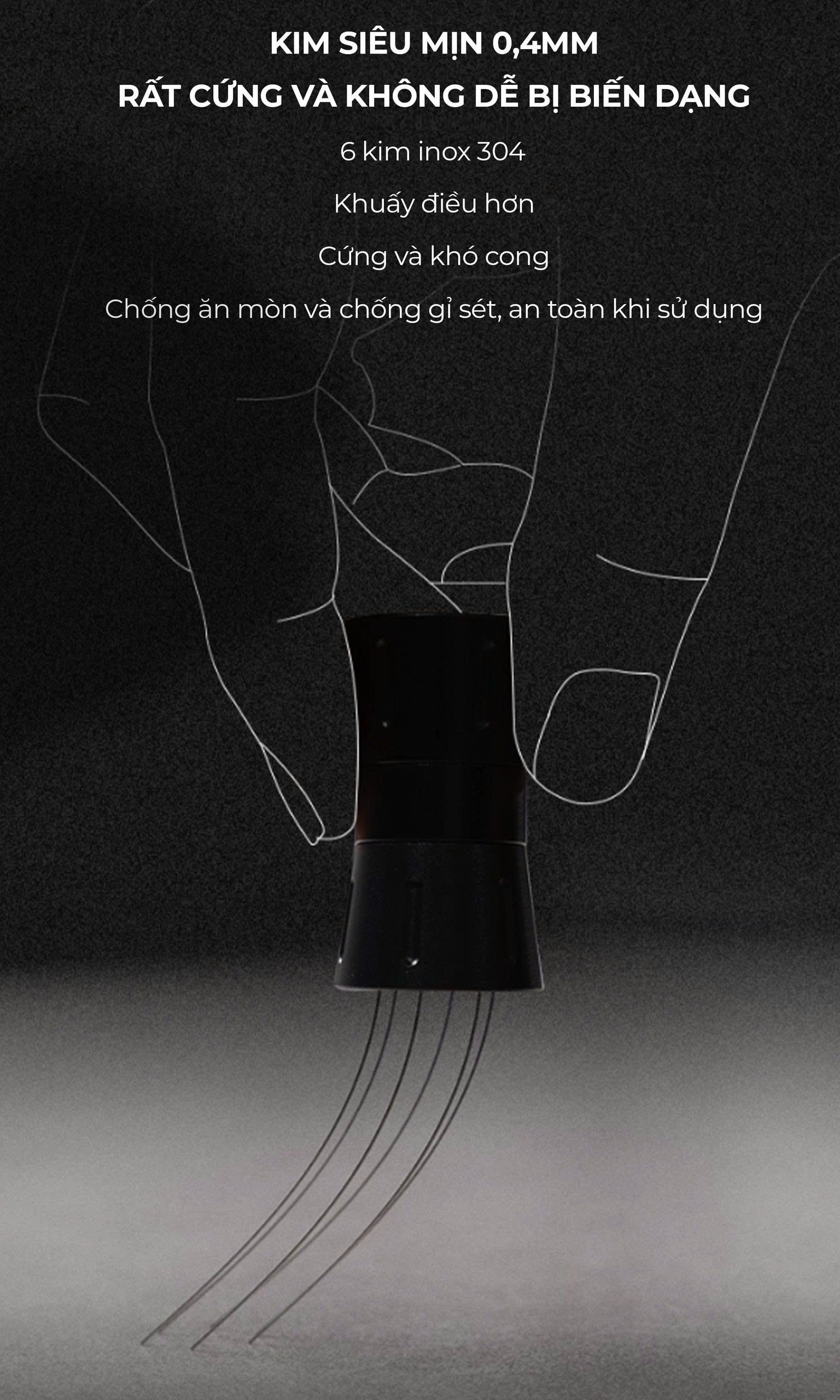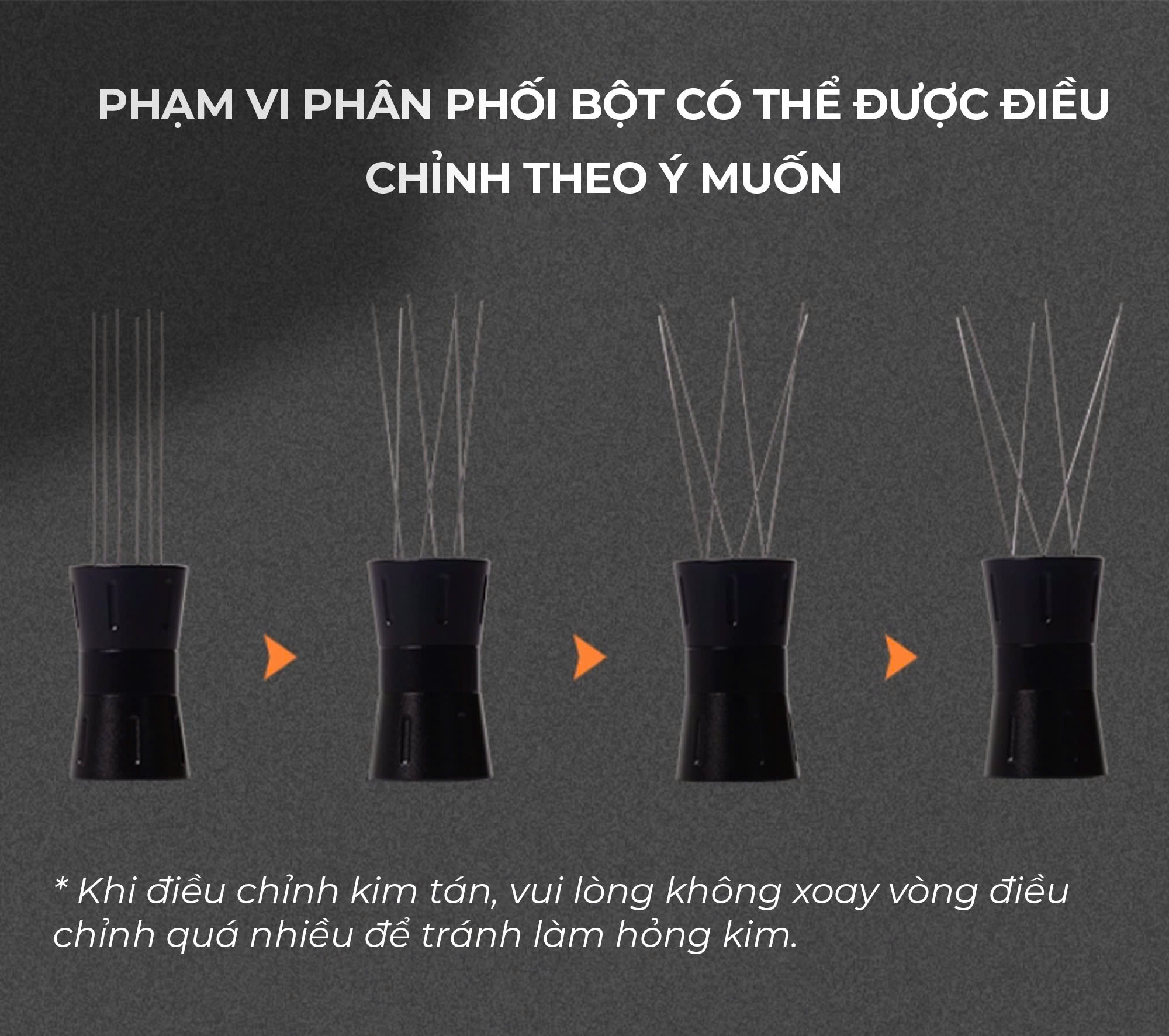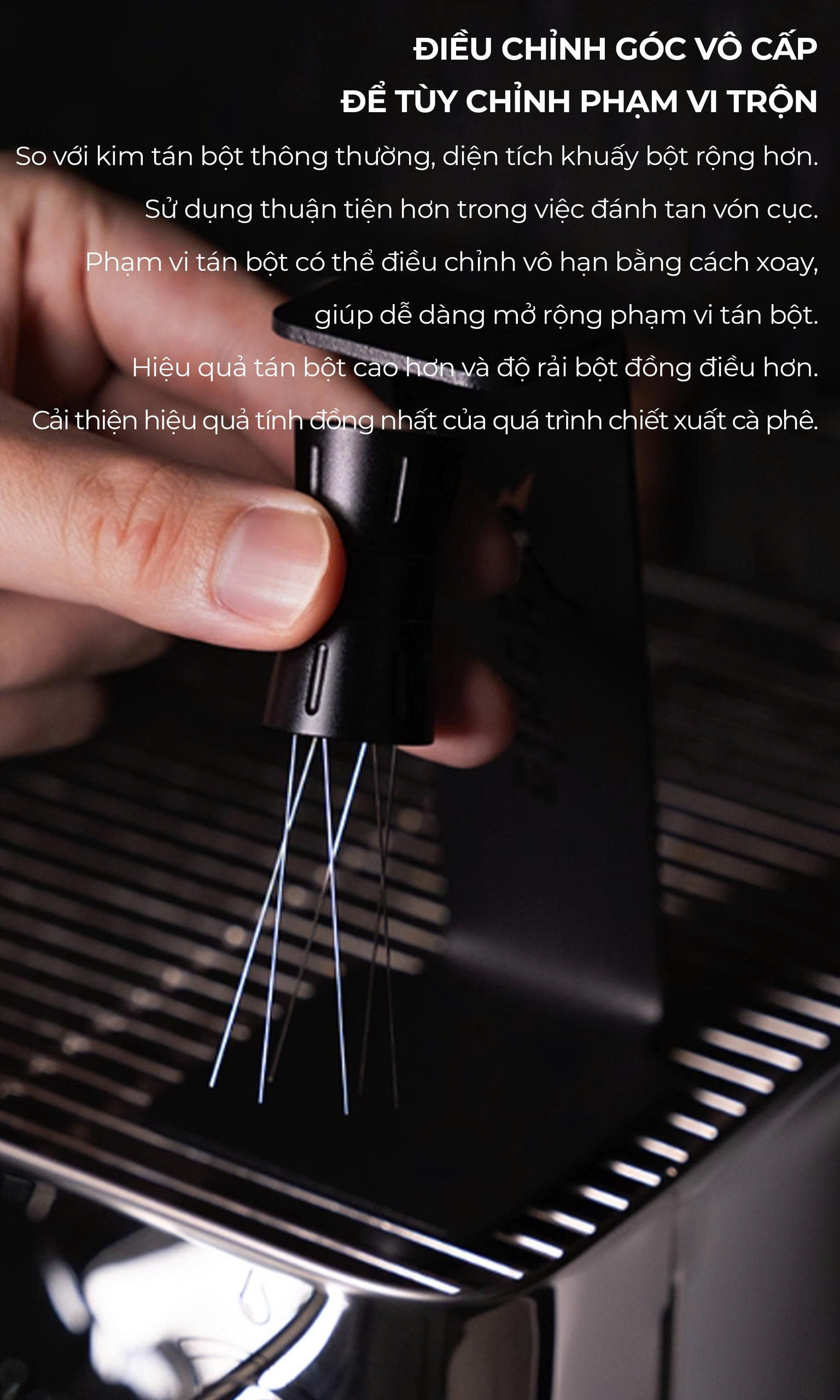 Sản phẩm được thiết kế dạng núm vặn bằng hợp kim nhôm sơn nhám. Cảm giác cầm rất chắc chắn và vừa tay. 8 thanh kim loại mỏng có độ dẻo và có thể uốn cong len lõi đánh tơi đến mọi nơi bên trong bánh cà phê. Khi bột được đánh tơi sẽ giúp phần tamping tốt hơn rất nhiều, áp suất nước sẽ chiết xuất đều hơn.
