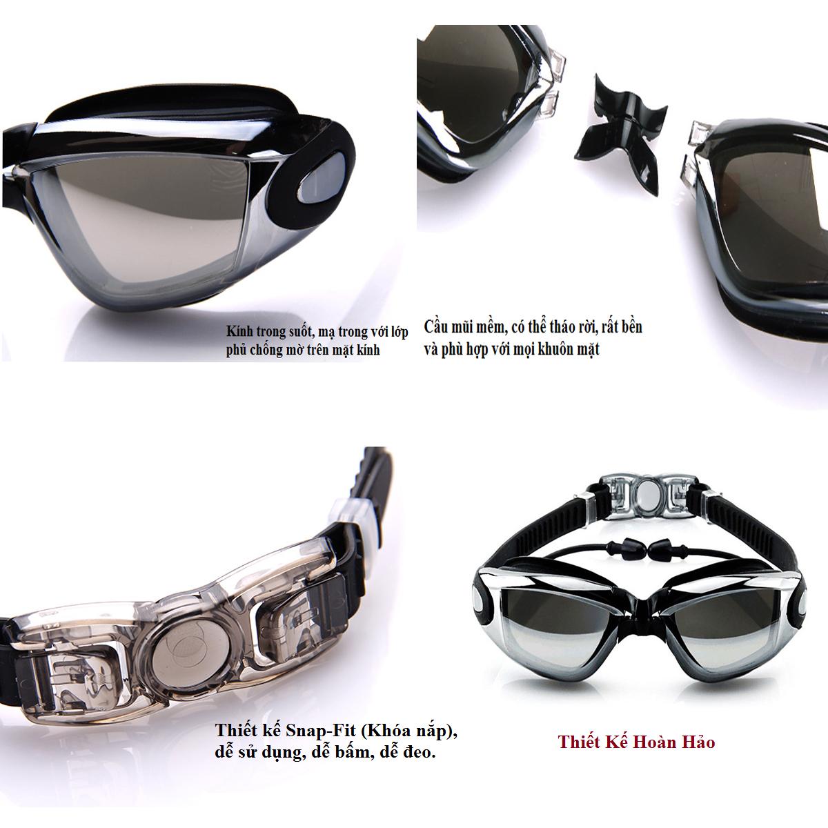 Kính bơi chống sương mù có nút bịt tai gồm Bịt Tai + Kẹp Mũi, kính bơi ngăn UV cao cấp. Tròng kính được làm từ chất liệu polycarbonate trong suốt, nhẹ, bền giúp người