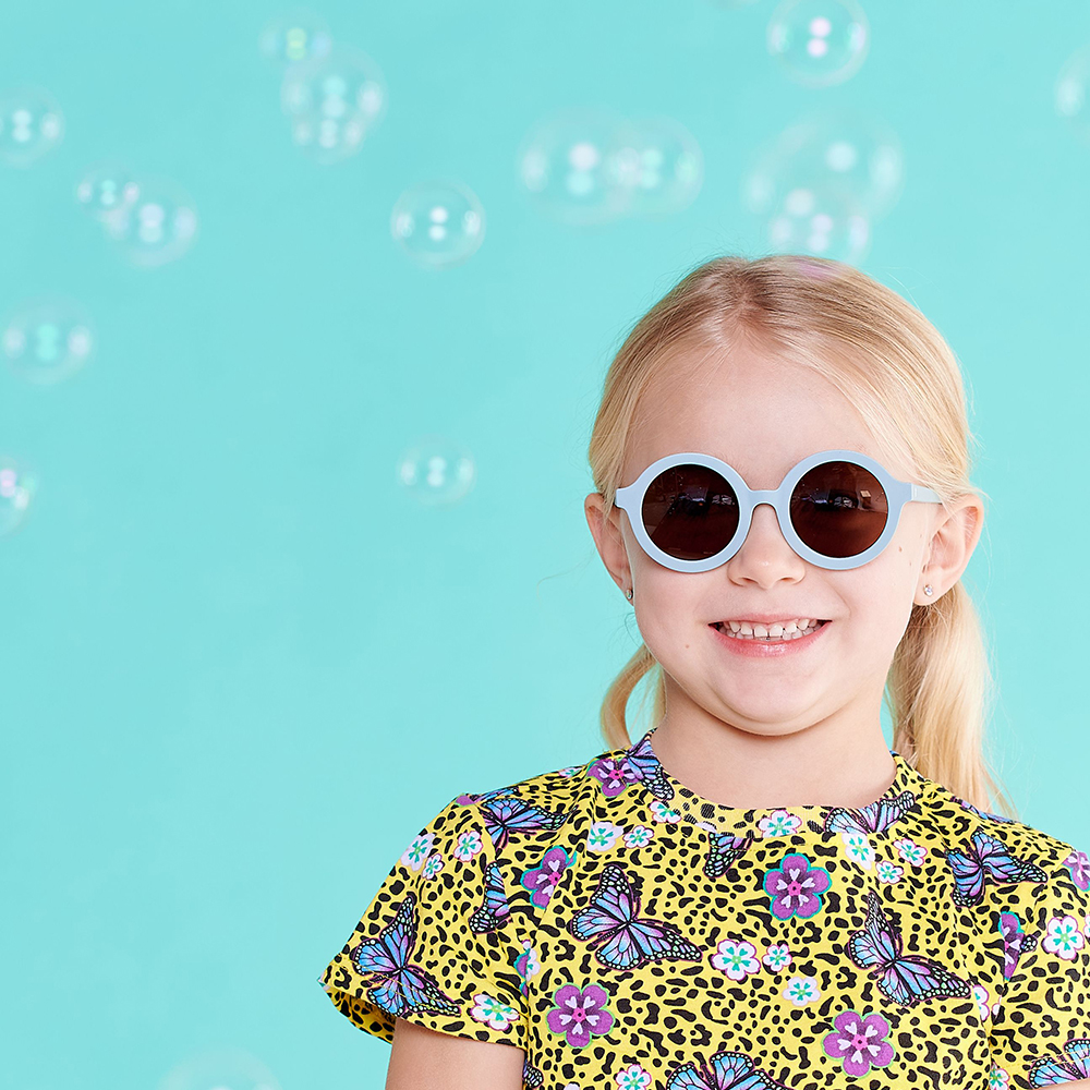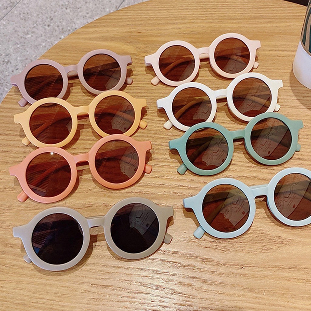 Ấn tượng: Kính chống tia cực tím với thiết kế hình tròn đáng yêu và màu xanh êm dịu phù hợp với cả bé trai và bé gái