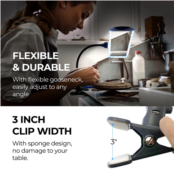 Đèn LED chống chói và có thể làm mờ hoàn toàn: Đèn phóng đại của chúng tôi được trang bị 28 đèn LED SMD sáng, dễ dàng xoay núm điều chỉnh độ sáng sang phải hoặc trái để điều chỉnh mức độ sáng mong muốn với khả năng làm mờ liền mạch.
