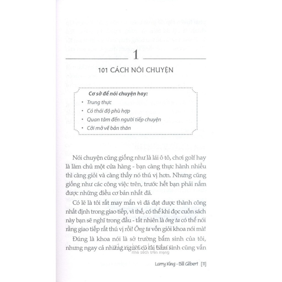 Ngày nào chúng ta cũng trò chuyện, tuy nhiên nói chuyện với mọi người, đặc biệt là với những người chúng ta chưa hề quen biết, đôi khi lại là một thách thức ám ảnh. Larry King, người đoạt giải thưởng về dẫn chương trình Larry King Live trên kênh truyền hình CNN, đã từng trò chuyện với mọi người, từ cựu Tổng thống Liên Xô Mikhail Gorbachev đến tài tử điện ảnh Marlon Brando. Trong cuốn sách này, ông chia sẻ những bí quyết để có thể giao tiếp một cách tự tin và có hiệu quả trong mọi trường hợp. Dù bạn đi dự tiệc cocktail, phỏng vấn tìm việc, hay phát biểu trước đám đông, thì luôn luôn có những phương pháp đơn giản để lôi cuốn người nghe và làm cho họ hiểu được thông điệp mà bạn muốn gửi đi - Và Larry King thì lại biết tất cả những kỹ năng ấy.