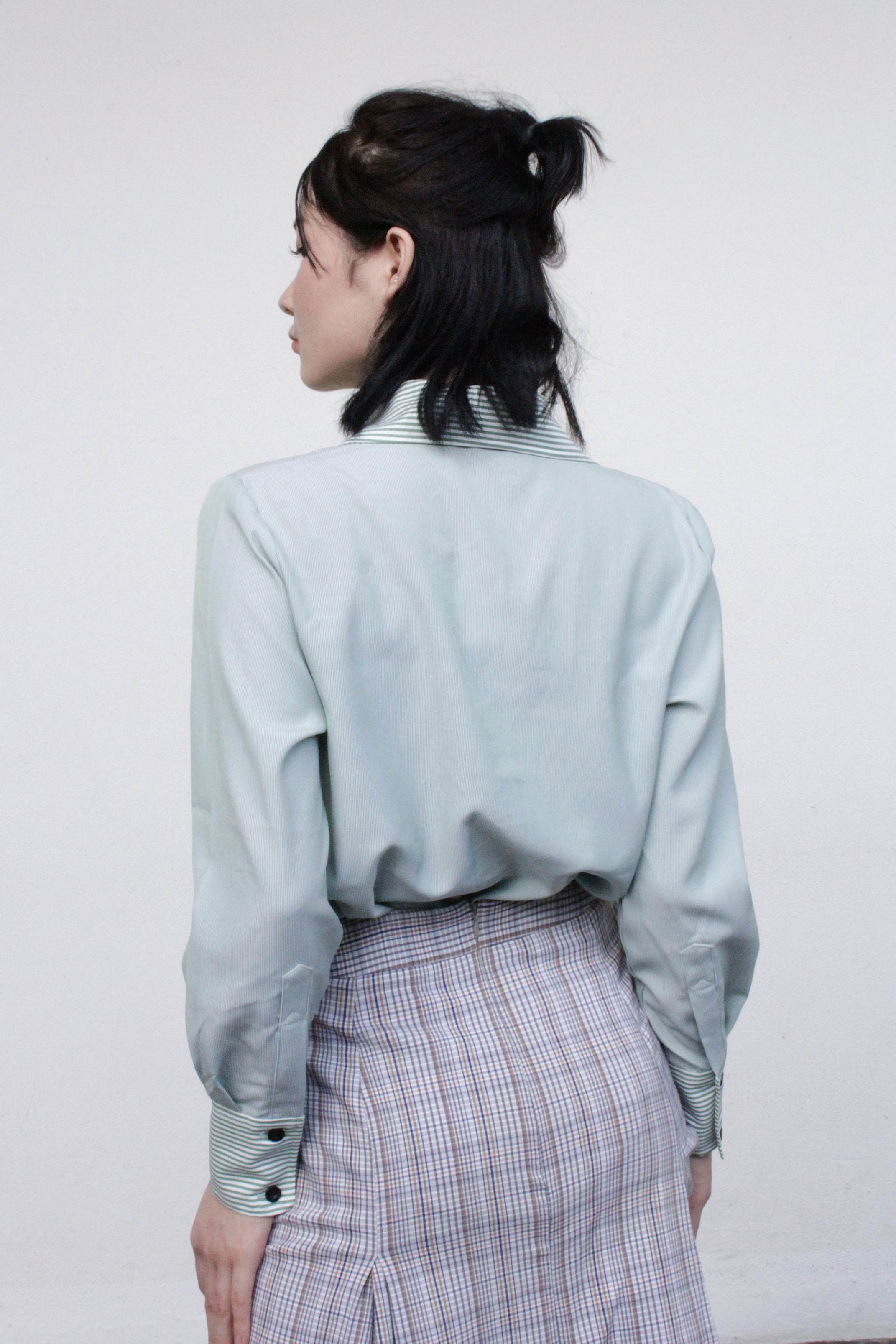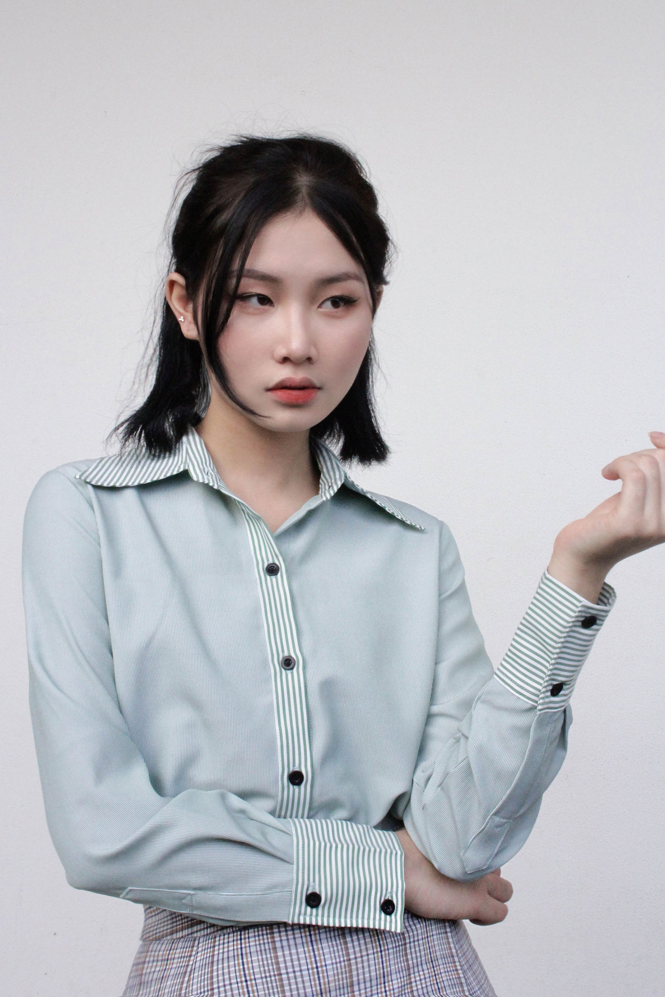 CHẤT SOMI COTTON PHA, MỀM ĐỨNG PHOM ÁO MÀU XANH LÁ ÁO CỔ SOMI, TAY DÀI, NÚT ĐEN PHOM CĂN BẢN SUÔN ĐIỂM NHẤN PHẦN LÁ CỔ, NẸP ÁO, MANGSET BẰNG VẢI HOẠ TIẾT KHÁC