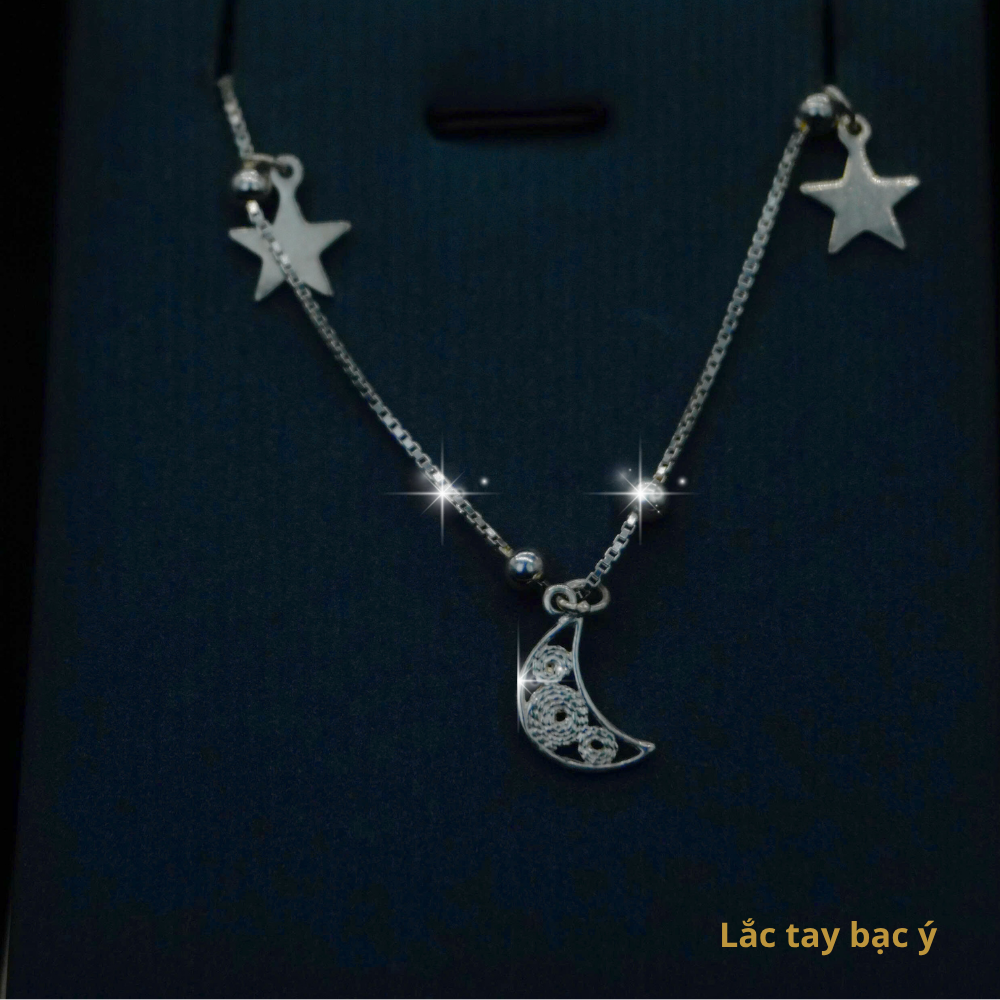 Đặc điểm: Đây là một chiếc lắc chân (ankle bracelet) bạc Ý với thiết kế thanh mảnh và các họa tiết biểu tượng độc đáo. Chiếc lắc chân có dạng dây mắt xích nhỏ, được trang trí bằng ba mặt charm treo: hai ngôi sao năm cánh và một mặt trăng lưỡi liềm. Các ngôi sao có vẻ trơn bóng, trong khi mặt trăng lưỡi liềm có thể được chạm khắc hoặc có họa tiết nổi tinh xảo trên bề mặt. Các hạt bạc nhỏ được xen kẽ trên dây, tạo điểm nhấn và sự mềm mại cho tổng thể. Chiếc lắc chân có móc khóa và phần dây điều chỉnh độ dài.