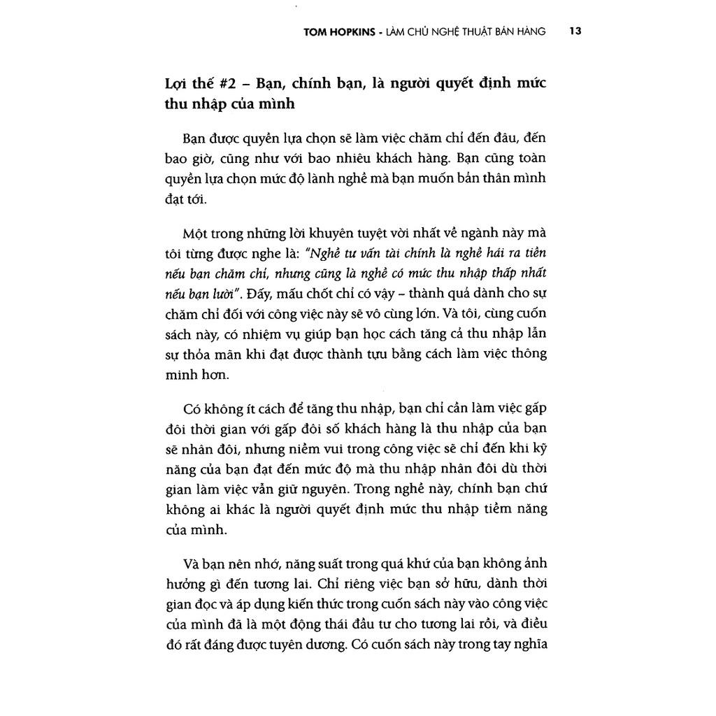 Cuốn sách LÀM CHỦ NGHỆ THUẬT BÁN HÀNG là tập hợp những phân tích, nghiên cứu của tác giả Tom Hopkins giúp người đọc, đặc biệt là những người đang dấn thân trên thương trường mở được cánh cửa thành công. Bất cứ lúc nào trong đời, bạn đều phải bán hàng: bạn “bán” hình ảnh của mình, của công ty mình; bạn “bán” thương hiệu của mình, “bán” cơ hội để được trò chuyện trực tiếp với mình, cơ hội được nhận những giá trị bạn trao đi, nhận các sản phẩm tài chính của bạn, những dịch vụ chuyên nghiệp của bạn và nhiều nữa.