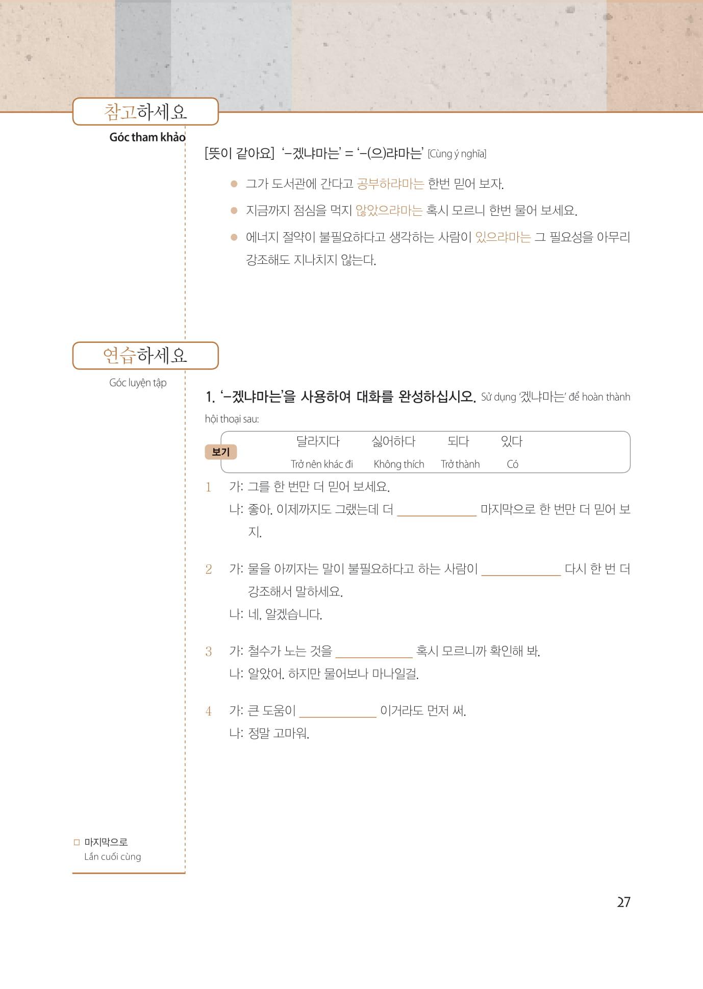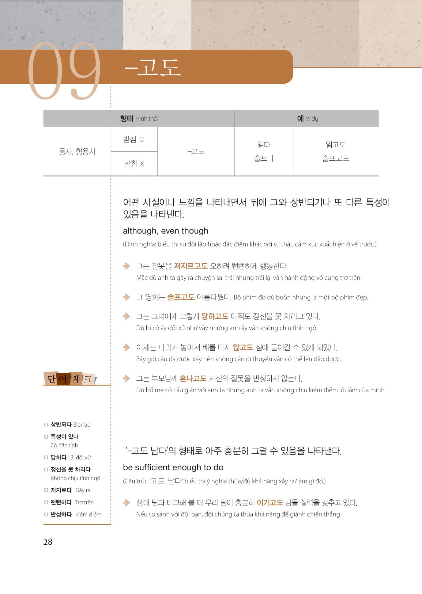 Cung cấp kho từ vựng, ví dụ đa dạng, cũng như các dạng bài tập điển hình giúp người học làm quen chính xác ý nghĩa và cách sử dụng tiếng Hàn