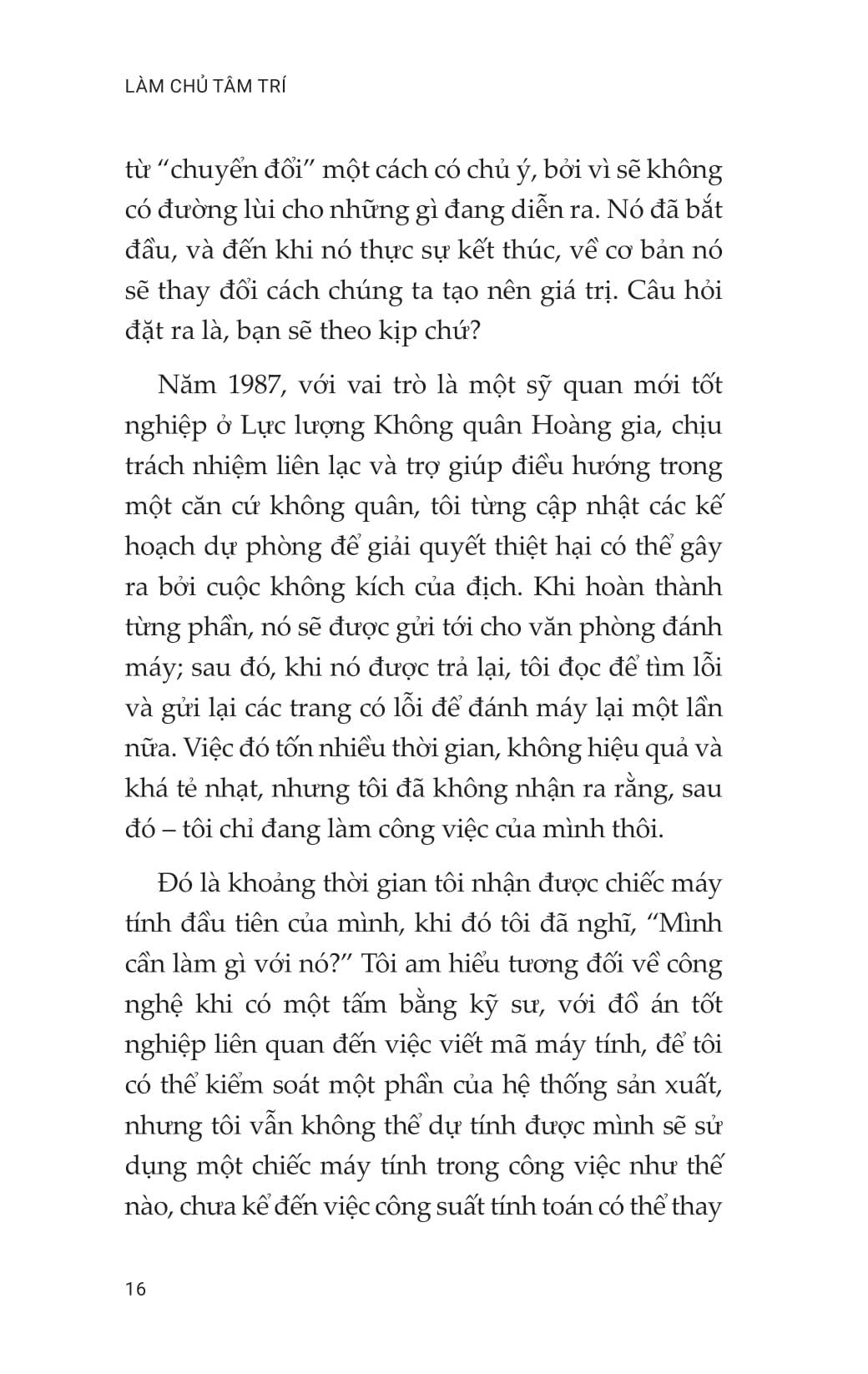 Đồng thời cuốn sách còn dạy bạn cách rèn luyện để thành công bằng việc cải thiện đáng kể sự tự nhận thức và tập trung chú ý hơn. Khi làm như vậy, bạn sẽ có khả năng phản hồi hơn là phản ứng, cho phép bạn đưa ra các quyết định linh hoạt, sáng tạo và phù hợp với thách thức phải đối mặt. Giống như tất cả mọi thứ đáng giá khác, việc ứng dụng các ý tưởng trong cuốn sách này sẽ cần một vài nỗ lực, đặc biệt ở mức độ tinh thần, nhưng kết quả – bao gồm sự phán xét hợp lý hơn, các mối quan hệ tốt hơn, cả trong công việc và trong cuộc sống của bạn nói chung – sẽ rất xứng đáng.