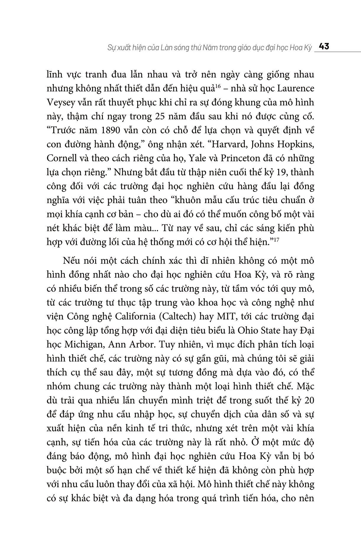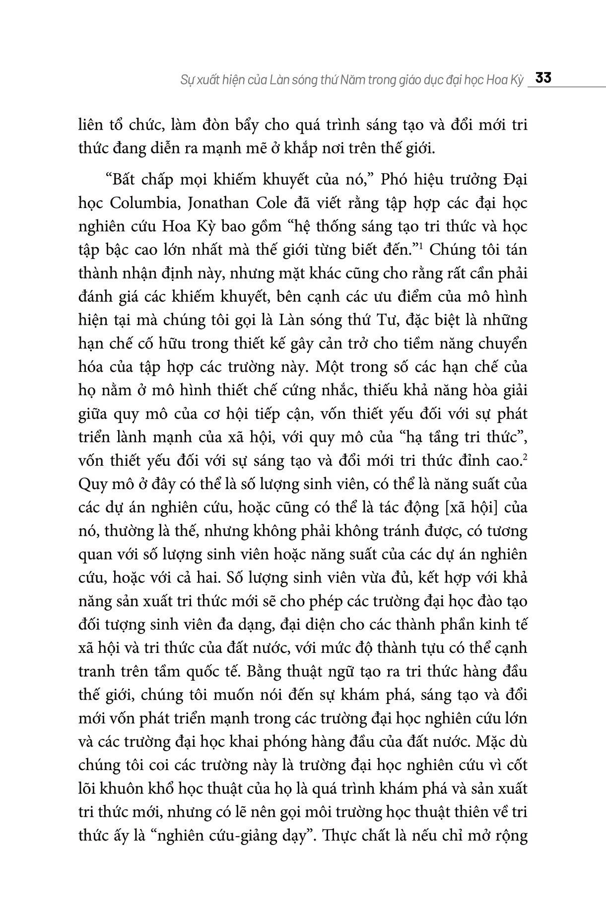 Làn Sóng Thứ Năm: Giáo Dục Khai Phóng Kiểu Mỹ Tái cấu trúc giáo dục đại học Hoa Kỳ Làn Sóng Thứ Năm: Giáo Dục Khai Phóng Kiểu Mỹ có thể được coi như một đề xuất tái cấu trúc giáo dục đại học Hoa Kỳ nói chung, dựa trên trường hợp thành công của Đại học Bang Arizona, và rộng hơn nữa là để tham khảo trong quá trình tái cấu trúc giáo dục đại học ở các nước trên thế giới, trong đó có Việt Nam, vốn đã có truyền thống hợp tác gần gũi, sâu rộng với ASU. Các tác giả của cuốn sách thực sự am hiểu sâu sắc về những gì nên và không nên làm trong giáo dục đại học: tận dụng mọi thế mạnh của sinh viên và hướng họ đến những vấn đề cấp bách nhất của thời đại. Trong The Fifth Wave: The Evolution of American Higher Education, Michael M. Crow và William B. Dabars lập luận rằng các trường cao đẳng và đại học cần được thiết kế lại toàn diện để có thể đào tạo càng nhiều sinh viên càng tốt và giữ nguyên chỉ tiêu tuyển sinh ngay cả khi thứ hạng của trường tăng lên (tức không tuyể sinh khắt khe hơn). Hai ông cho rằng chính sách tuyển sinh quá nghiêm ngặt của các trường như Harvard và Yale chỉ có nghĩa là họ đã chọn những sinh viên mà thành công sau này ít nhiều đã được bảo đảm, dù thế nào. Theo ông, việc đào tạo những sinh viên có khả năng và cơ hội thành công thấp hơn mới mang lại nhiều giá trị. Các nghiên cứu mới đây đã chứng minh ý kiến của ông là đúng. Làn Sóng Thứ Năm: Giáo Dục Khai Phóng Kiểu Mỹ - Làn sóng của tri thức và công nghệ Về mặt tên gọi, Crow và Dabars phân chia lịch sử giáo dục đại học Hoa Kỳ thành các làn sóng nối tiếp nhau từ các trường thời lập quốc (Làn sóng thứ Nhất) cho đến các trường đại học nghiên cứu (Làn sóng thứ Tư), và Làn sóng thứ Năm đang dần hình thành sẽ bao gồm một liên minh các trường cao đẳng và đại học có mong muốn mang lại tác động tích cực cho xã hội thông qua sự tích hợp liền mạch giữa sản xuất tri thức đẳng cấp thế giới và đổi mới công nghệ. Các trường thuộc Làn sóng thứ Năm như Đại học Bang Arizona đã bắt đầu mở rộng mạng lưới bao gồm học viện, doanh nghiệp, các cơ quan chính phủ, phòng thí nghiệm và các tổ chức xã hội dân sự. Tập hợp các thiết chế này ưu tiên tiếp cận nhóm nhân khẩu học rộng nhất có thể, đại diện cho các thành phần kinh tế xã hội và trí tuệ đa dạng trong xã hội. Ý tưởng về Làn sóng thứ Năm thực sự rất tuyệt vời. Với các dữ liệu phong phú và sự thật thú vị về các trường đại học, được đúc kết từ nhiều lĩnh vực khác nhau từ thiết kế, kinh tế, chính sách công, lý thuyết tổ chức, nghiên cứu khoa học và công nghệ, xã hội học, tâm lý học và thậm chí nhận thức luận, các tác giả đã trình bày một chủ đề quan trọng, đầy hứa hẹn và tôi tin rằng với bất kỳ ai quan tâm đến tương lai của giáo dục đại học đều không nên bỏ qua Làn sóng thứ Năm: Giáo Dục Khai Phóng Kiểu Mỹ.