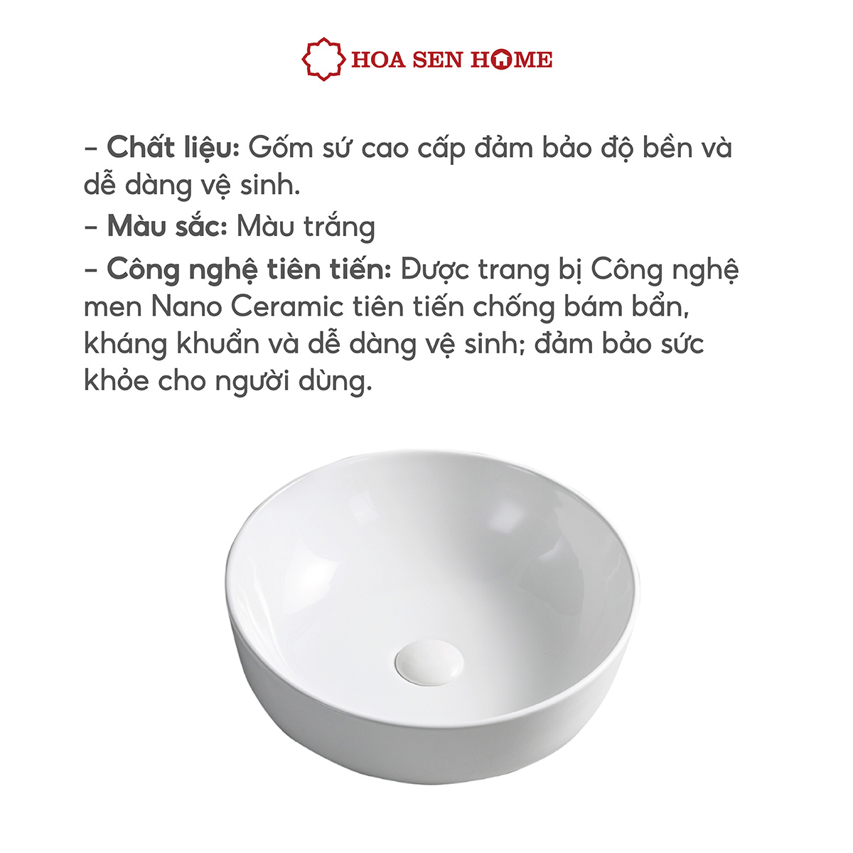 - Màu sắc: Trắng - Tráng men công nghệ cao, chống bám bẩn, lau rửa dễ dàng - Có thể lắp đặt trên bàn đá, tủ lavabo. - Chất liệu sứ cao cấp với lớp men