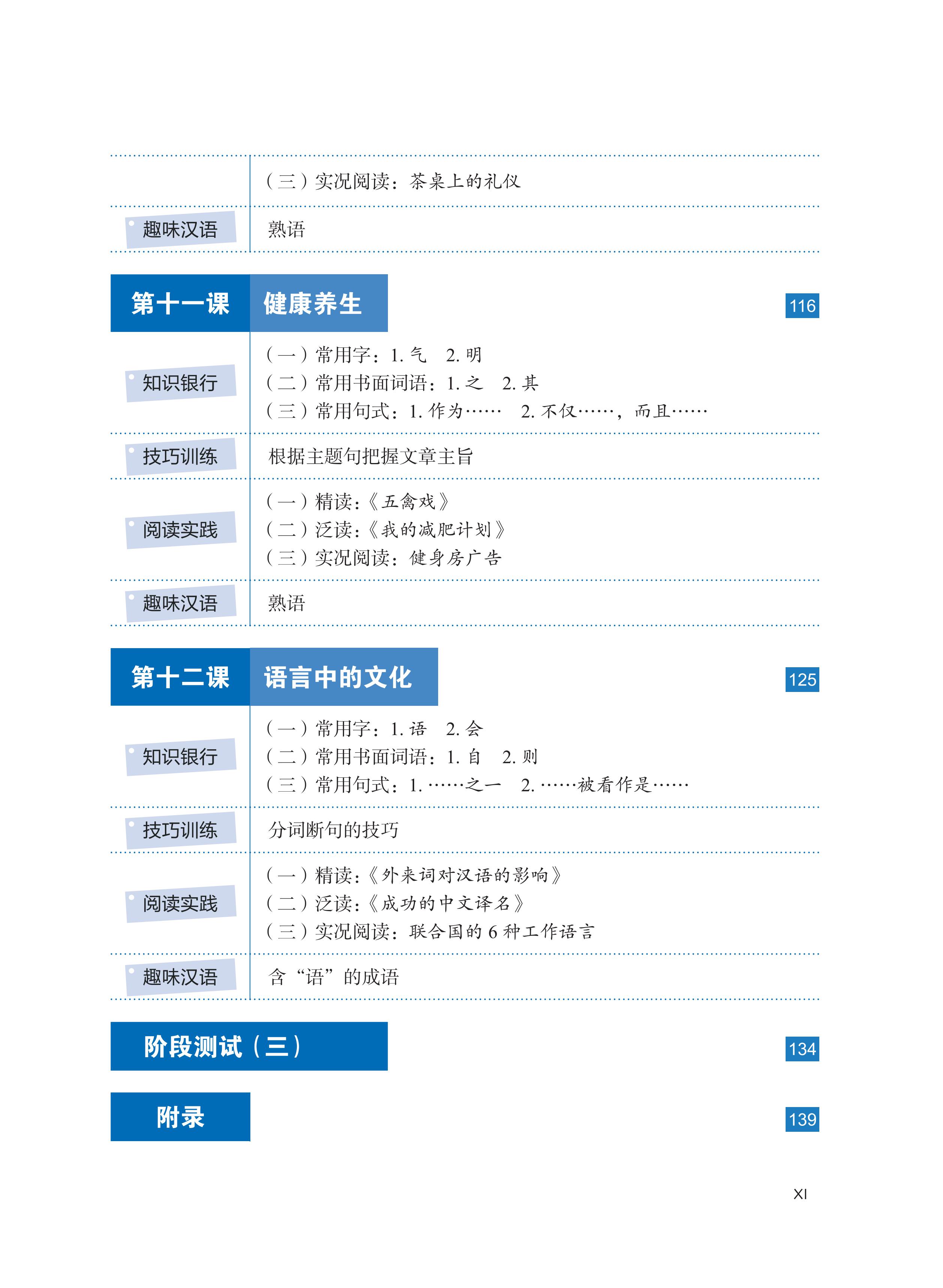 Phần 3: Thực tiễn đọc hiểu. Bao gồm ba phần lớn là đọc chuyên sâu, đọc mở rộng và đọc thực tế. Phần “Đọc chuyên sâu” và “Đọc mở rộng” bao gồm các nội dung như: học tập các từ vựng trọng tâm và từ vựng mở rộng thuộc các chủ đề thường gặp, bài tập khởi động, bài tập lý giải nội dung bài khóa, lý giải nghĩa câu và lý giải nghĩa từ, v.v., đồng thời trên cơ sở này hướng dẫn người học nắm được ý chính của bài khóa, vận dụng từ vựng trọng tâm thuộc chủ đề bài khóa để trình bày quan điểm, giới thiệu nội dung có liên quan một cách ngắn gọn. Phần “Đọc thực tế” bao gồm hai loại: Loại thứ nhất - “Đọc văn thuyết minh”, giúp người học tích lũy thường thức về lịch sử, văn hóa cần có đồng thời được tiếp xúc rộng rãi trong học tập và sinh hoạt thường ngày; loại thứ hai - “Tra tìm thông tin”, như tra tìm các thông tin du lịch, bảng giờ tàu xe, bảng các triều đại lịch sử, v.v., việc thiết kế nhiệm vụ nhấn mạnh tính ứng dụng, mục đích nhằm giúp người học giải quyết các vấn đề thường gặp trong học tập và sinh hoạt thường ngày.
