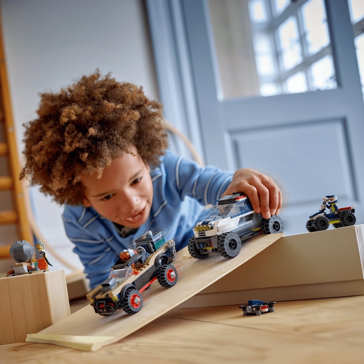 Trời ơi! Một tên tội phạm lái chiếc xe tải cơ bắp đang trốn thoát với tốc độ cao qua vùng nông thôn Lego City, mang theo một chiếc két sắt đầy vàng thỏi và kim cương. Hãy điều động xe mô tô cảnh sát và máy bay không người lái, nhảy lên chiếc xe địa hình và đuổi theo. Lắp ráp chiếc xe truy đuổi tuyệt vời của bạn để vượt qua những địa hình gồ ghề một cách dễ dàng. Nhưng cẩn thận – một tên tội phạm khác với trang bị đá lớn đang ẩn nấp chờ đợi!