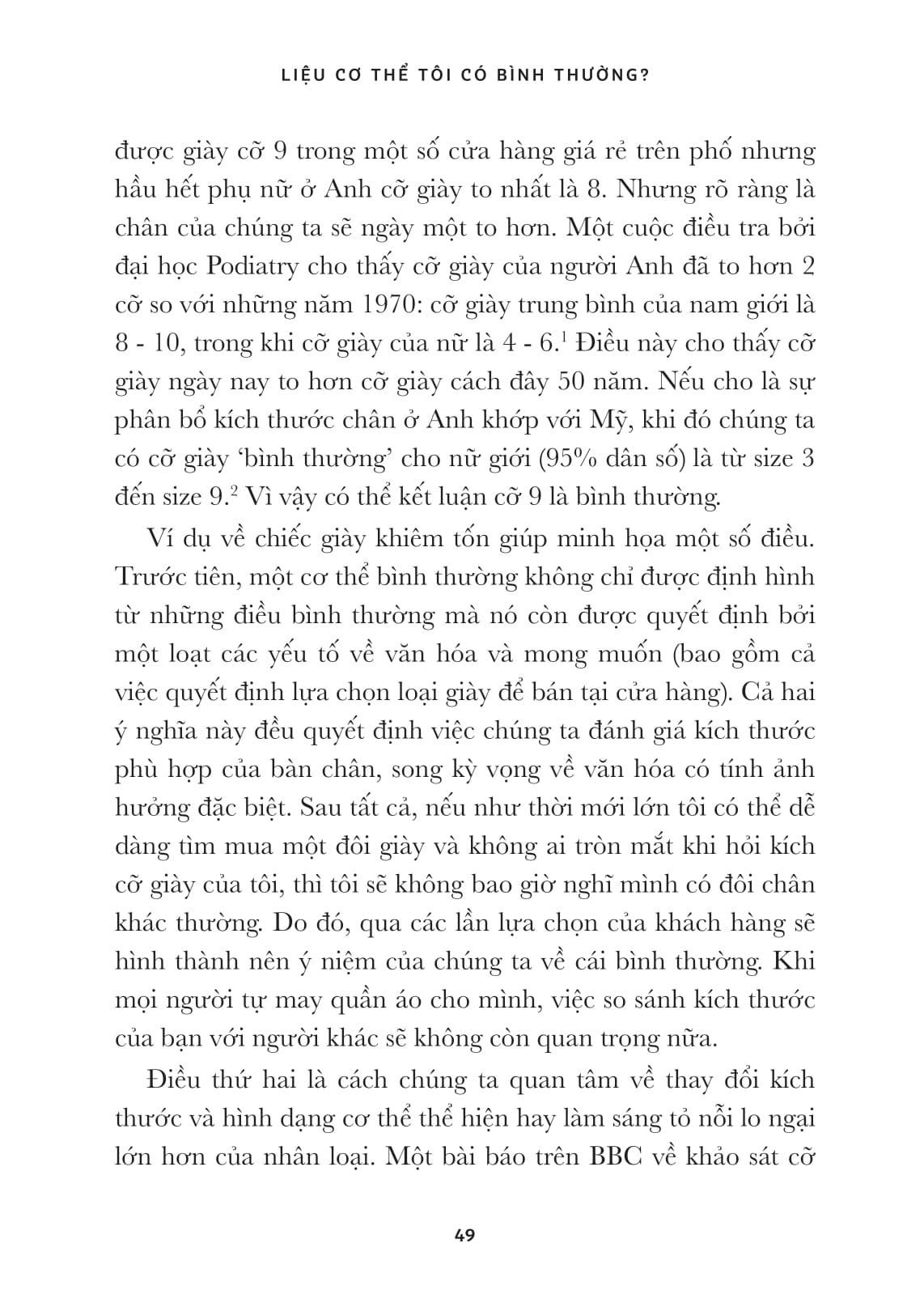 Các vấn đề đặt ra trong sách đều thú vị, đi từ giải thích thuật ngữ "bình thường" từ cổ chí kim đến các băn khoăn liệu cơ thể m.ình có bình thường? Tâm trí, đời sống tình dục, cảm xúc... của m.ình có bình thường chăng? Con của m.ình có bình thường, có giống hay bằng “con nhà người ta” không? Cả xã hội này có bình thường?
