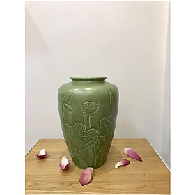 Bình hoa Bát Tràng cao cấp, hàng chuẩn loại 1 với kiểu dáng đùi ếch (phần đáy bình nhỏ, phình to ở phần trên và miệng bình) phối với họa tiết hoa đắp nổi cầu