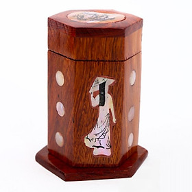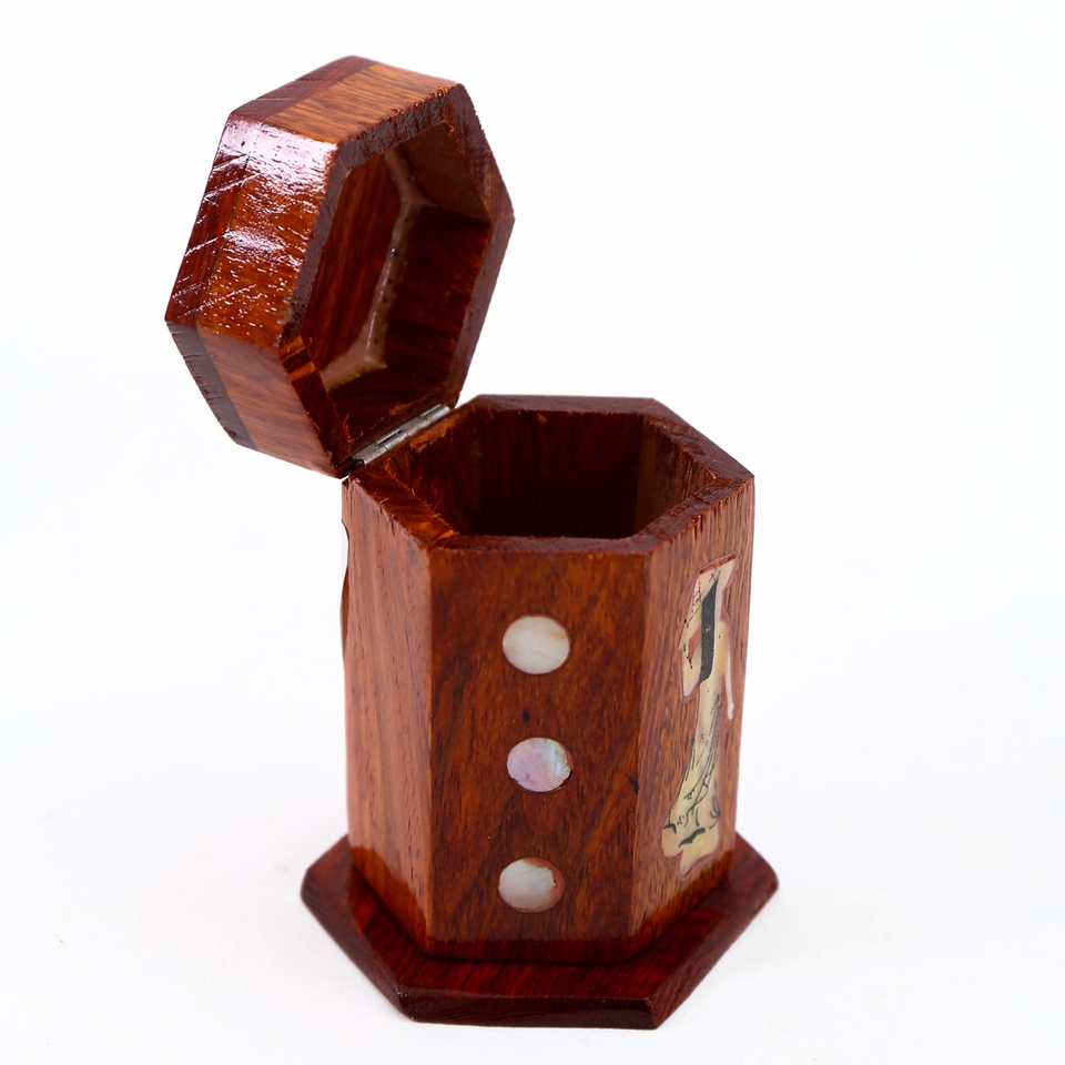 Thông tin sản phẩm Thiết kế tinh tế theo phong cách đồ gỗ mỹ nghệ khảm trai. - Ống đựng tăm có thể đóng mở, tiện lợi khi sử dụng. - Chất liệu gỗ bền