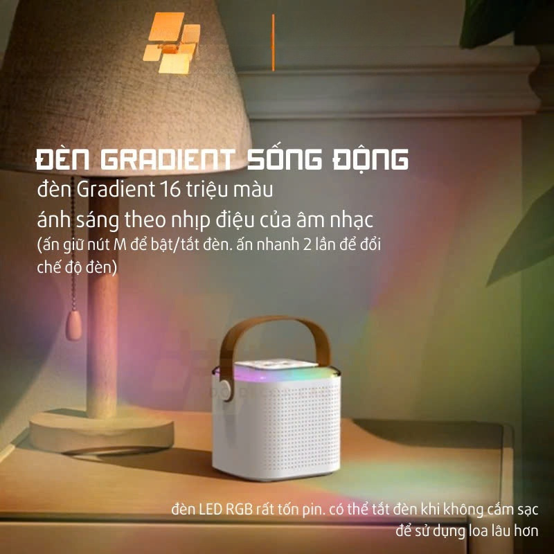 Chức năng chính: nghe nhạc, làm loa phát nhạc, loa thông báo, Hát Karaoke trên điện thoại ghi âm bài hát đã thể hiện. Kết nối: Bluetooth, USB, MicroSD Màu: Hồng, Vàng, Đen