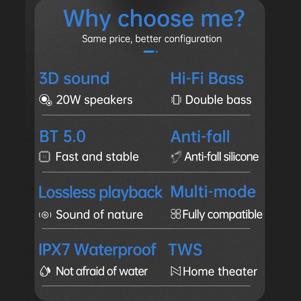 Features: 10W full frequency range pronunciation unit, bass and surround sound reverberation match, lets you listen to great music. BT 5.0, high data transmission speed, stable performance, and low power consumption, delivers great sound quality.