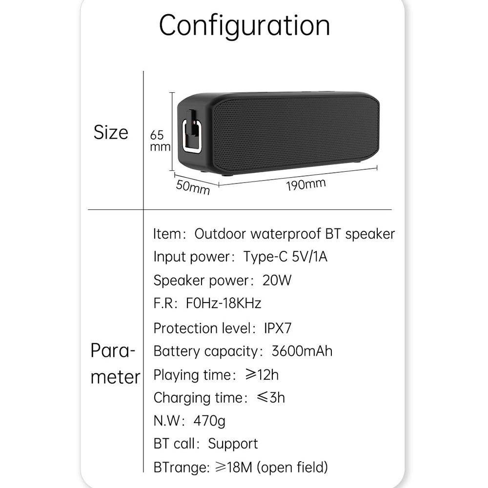 Features: Wireless portable BT speaker: Enjoy a High Definition stereo sound with a impressive volume whether you're lounging around the house,or partying, walking out, camping, hiking, biking. IPX7 Professional Waterproof: Military-grade three defense, use 20W20