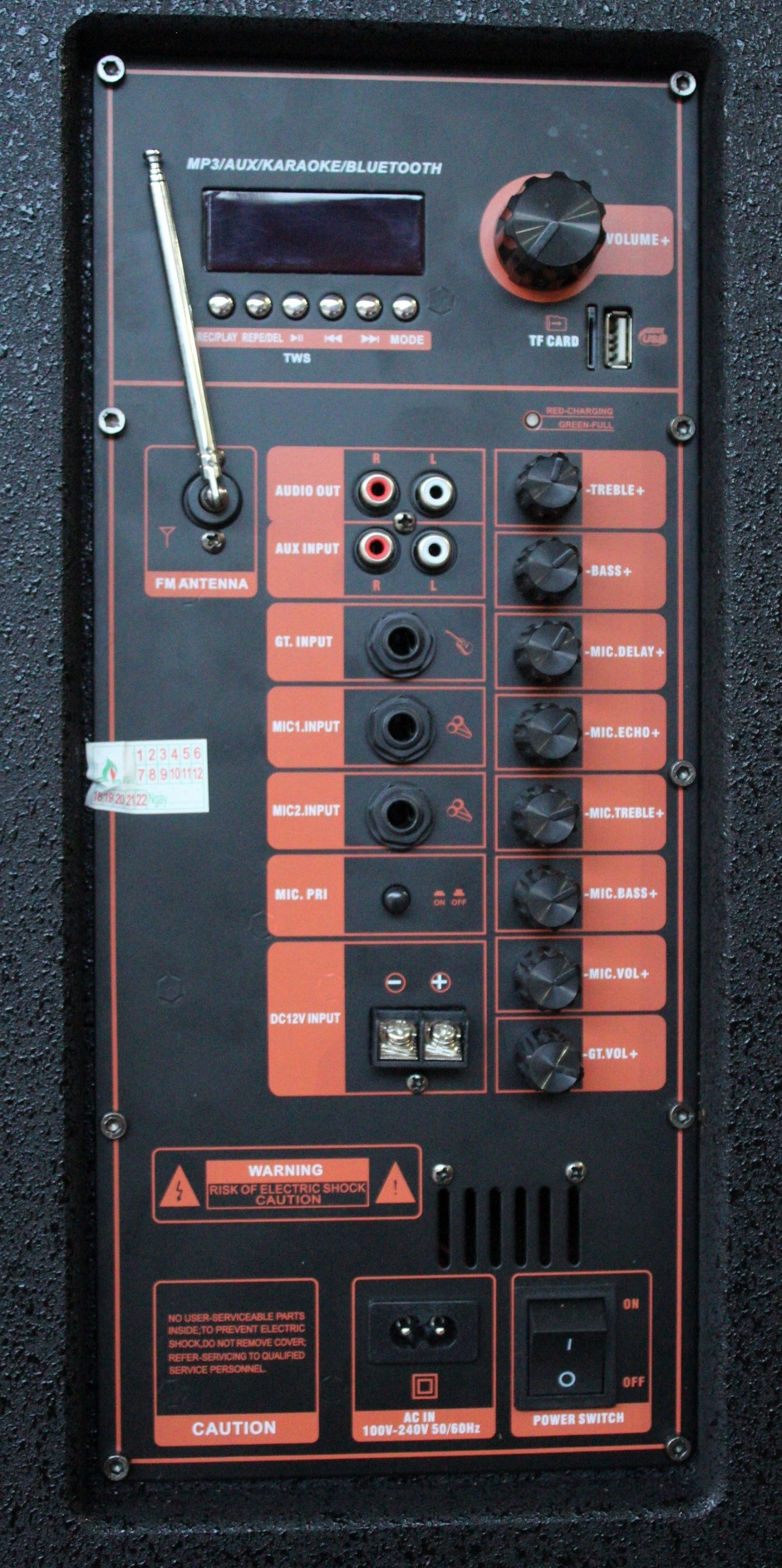 _Nguồn DC 12V bat in _ Bass 2T x 2, Treble x 2, mid x 2 _ Sử dụng bo CLASS D _Hỗ trợ USB, HDMI, Bluetooth, guitar in, mic in _Phụ kiện 2 mic
