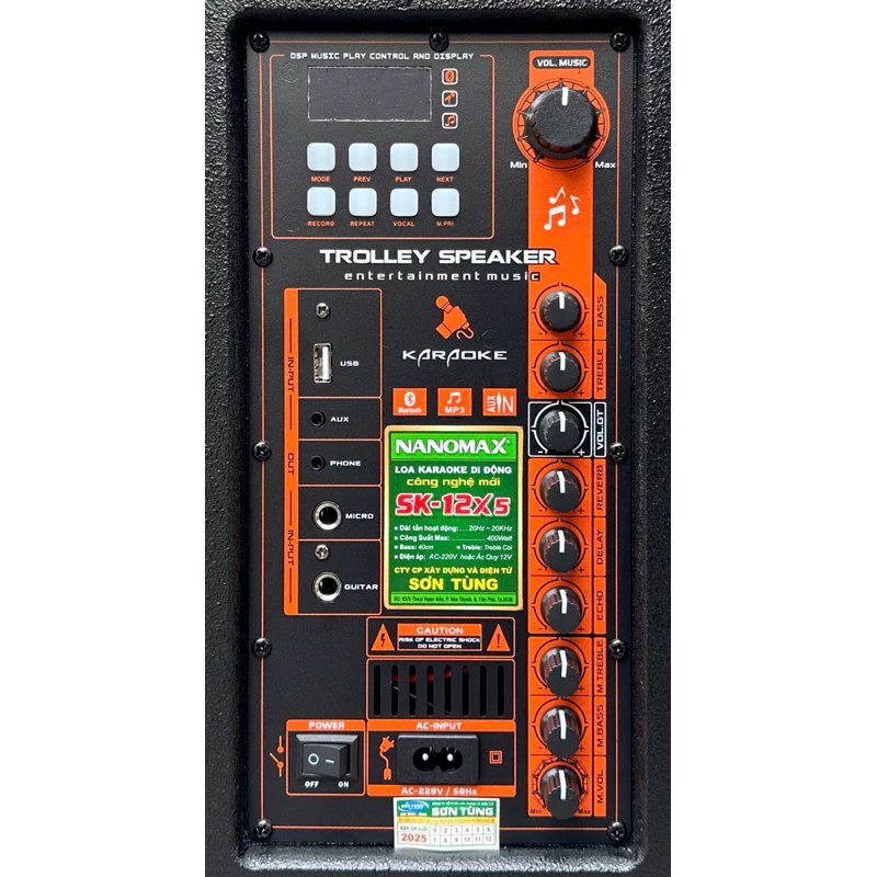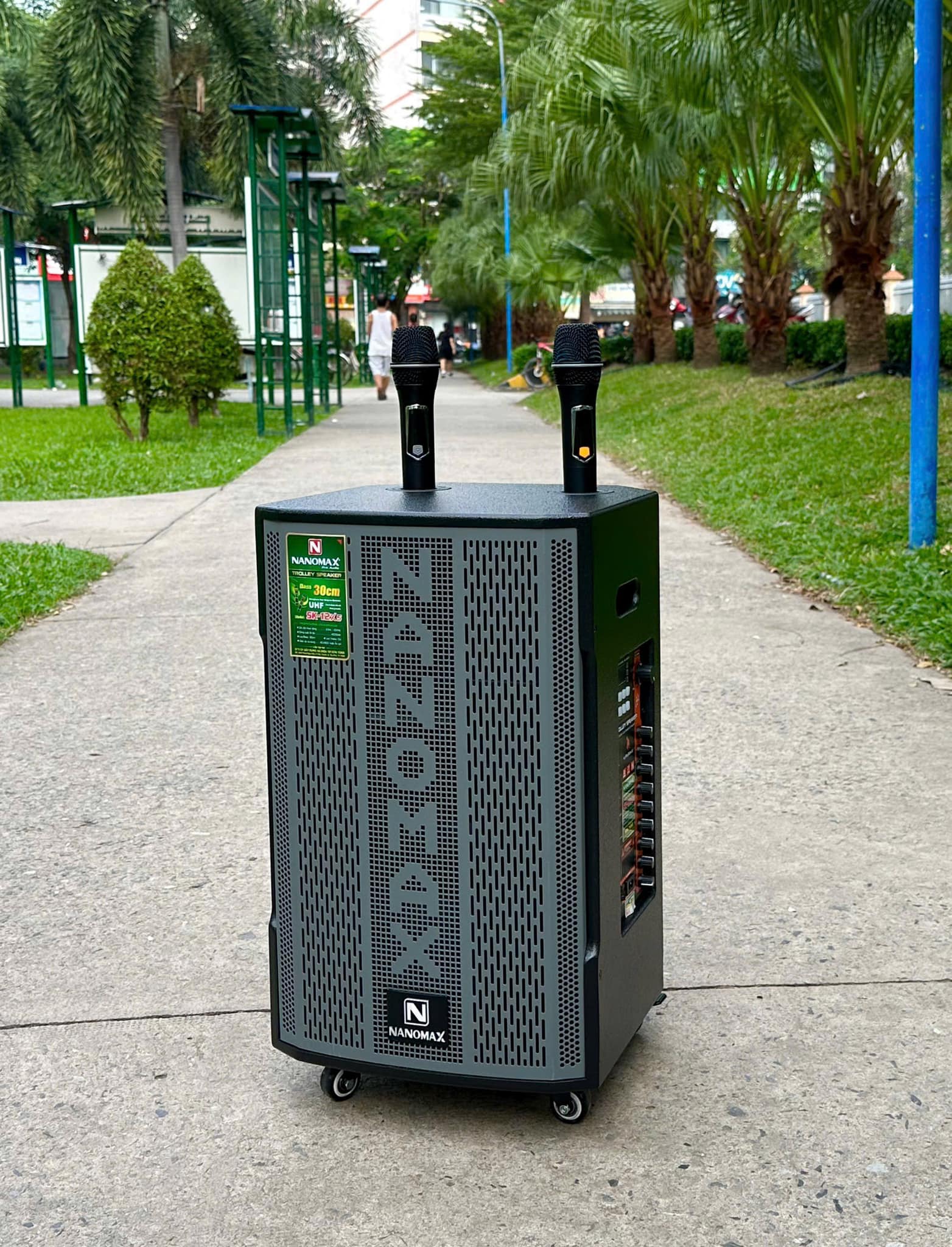 Loa karaoke bluetooth Nanomax SK-12X5 phiên bản siêu cải tiến năm 2025 với sự thay đổi hoàn toàn kiểu dáng, tính năng nâng cấp toàn diện đáp ứng mọi nhu cầu hát karaoke. THÔNG SỐ LOA KARAOKE NANOMAX SK-12X3: • Loại: Hát karaoke di động • Mã: SK-12X3 • Số lượng kênh: 2 đường tiếng • Công suất: 400W • Thời gian sạc: 2 giờ • Thời gian pin: 3.5 tiếng ở tải 80% & 7.5 tiếng ở tải 60% • Vừa cắm điện sạc vừa dùng • Tiện ích: Cổng USB, Cổng thẻ nhớ Micro-SD • Kết nối không dây: Bluetooth NANO chuẩn 5.0 bắt xa tới 15m • Kết nối khác: Jack RCA Audio IN/OUT kết nối với Micro có dây và Đàn Guitar bên ngoài • Kích thước/ Trọng lượng: (35x34x61.5)cm / 16kg • Chất liệu thùng: Gỗ sơn gai mịn màu đen chống trầy • Thương hiệu: Nanomax • Sản xuất tại: Việt Nam • Bảo hành loa bass, treble và vĩ bo mạch chính: 12 tháng • Kích thước bass: 12 inch (~30cm) • Số lượng loa: 1 bass + 1 treble họng còi • Dây điện nguồn: 01 sợi • Micro: 02 cây • Pin: 04 viên ĐIỂM NỔI BẬT CỦA LOA KẸO KÉO NANOMAX 3 TẤC SK-12X5: Điểm đặc biệt ở loa bluetooth Nanomax SK-12X3 là bảng điều khiển siêu đẹp mắt, dễ sử dụng, lại thêm màn hình led theo dõi tình trạng pin và xác định chế độ loa (ghi âm/ bluetooth, dùng pin/ điện trực tiếp). Có thể sạc bằng ác quy dự phòng trong trường hợp hát karaoke ngoài trời hết pin mà không có điện. Loa tách riêng phần chỉnh micro với beat, dễ dàng chỉnh riêng volume, bass, treble cho beat và volume, bass, treble, echo, delay cho giọng hát. Công nghệ Bluetooth 5.0 kết nối không dây hát bất kỳ đâu, dễ dàng thao tác trên smartphone, tự động nhớ và kết nối với điện thoại trong những lần sau. Loa kéo Nanomax tích hợp nhiều chức năng: karaoke, nghe nhạc di động, nghe qua thẻ nhớ, record qua USB, jack cắm cho các nguồn phát như đầu CD/DVD, máy tính, tivi… Micro làm từ kim loại sáng bóng, chắc chắn, vàng gold sang trọng, chống va chạm mạnh, band tần UHF chỉnh tần số theo ý muốn. Bánh xa có chốt an toàn giúp cố định loa. Loa bluetooth Nanomax SK-12X5 phù hợp cho công ty, phòng họp, hội trường, hát karaoke gia đình, quán ăn, shop bán đồ, nhà hàng… BẢO HÀNH LOA KARAOKE NANOMAX: • 1 đổi 1 tháng đầu nếu lỗi sản xuất • Bảo hành micro, ắc quy: 6 tháng • Hỗ trợ sửa chữa: 5 năm CÁCH DÙNG LOA BLUETOOTH NANOMAX: Loa đã đầy pin, khi nhận bật loa, chọn chế độ blue tại nút Mode, kết nối bluetooth điện thoại với loa. Cho pin vào micro, mở mic, chọn bài hát trên điện thoại, test mic, chỉnh bass, treble, echo, volume cho phù hợp. CAM KẾT CỦA CHÚNG TÔI: • Chính hãng Nanomax • Sản phẩm luôn được kiểm tra kỹ trước khi đóng gói vận chuyển