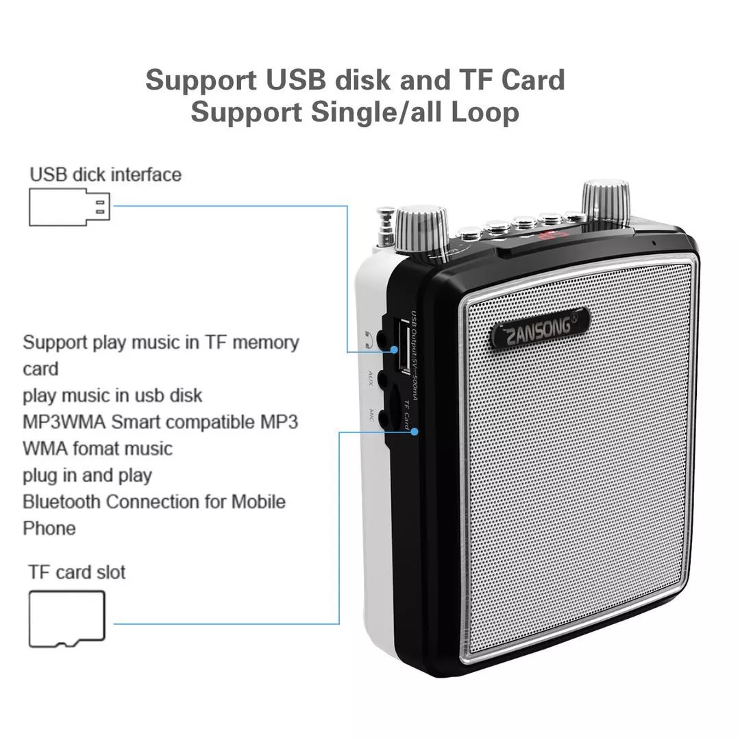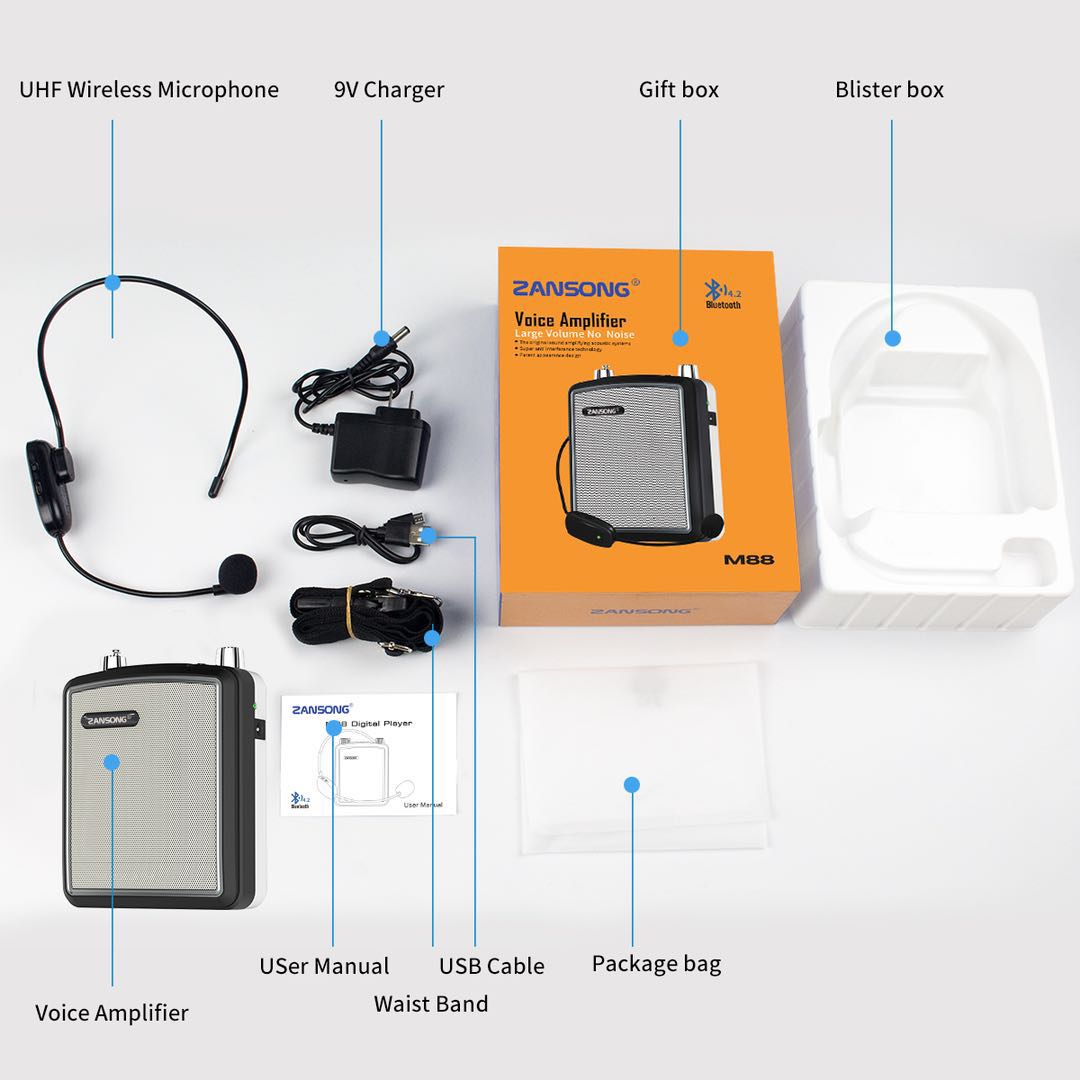 LOA TRỢ GIẢNG ZANSONG M88 - MÁY TRỢ GIẢNG KÈM MICRO CÀI TAI KHÔNG DÂY - KẾT NỐI BLUETOOTH 4.2, AUX, USB, SD CARD, FM - CÔNG SUẤT 10W - CÓ ECHO HÁT KARAOKE DỄ DÀNG - PIN SẠC DUNG LƯỢNG LỚN CHO THỜI GIAN SỬ DỤNG LÊN ĐẾN 6H - ÂM THANH RÕ RÀNG, SẮC NÉT
