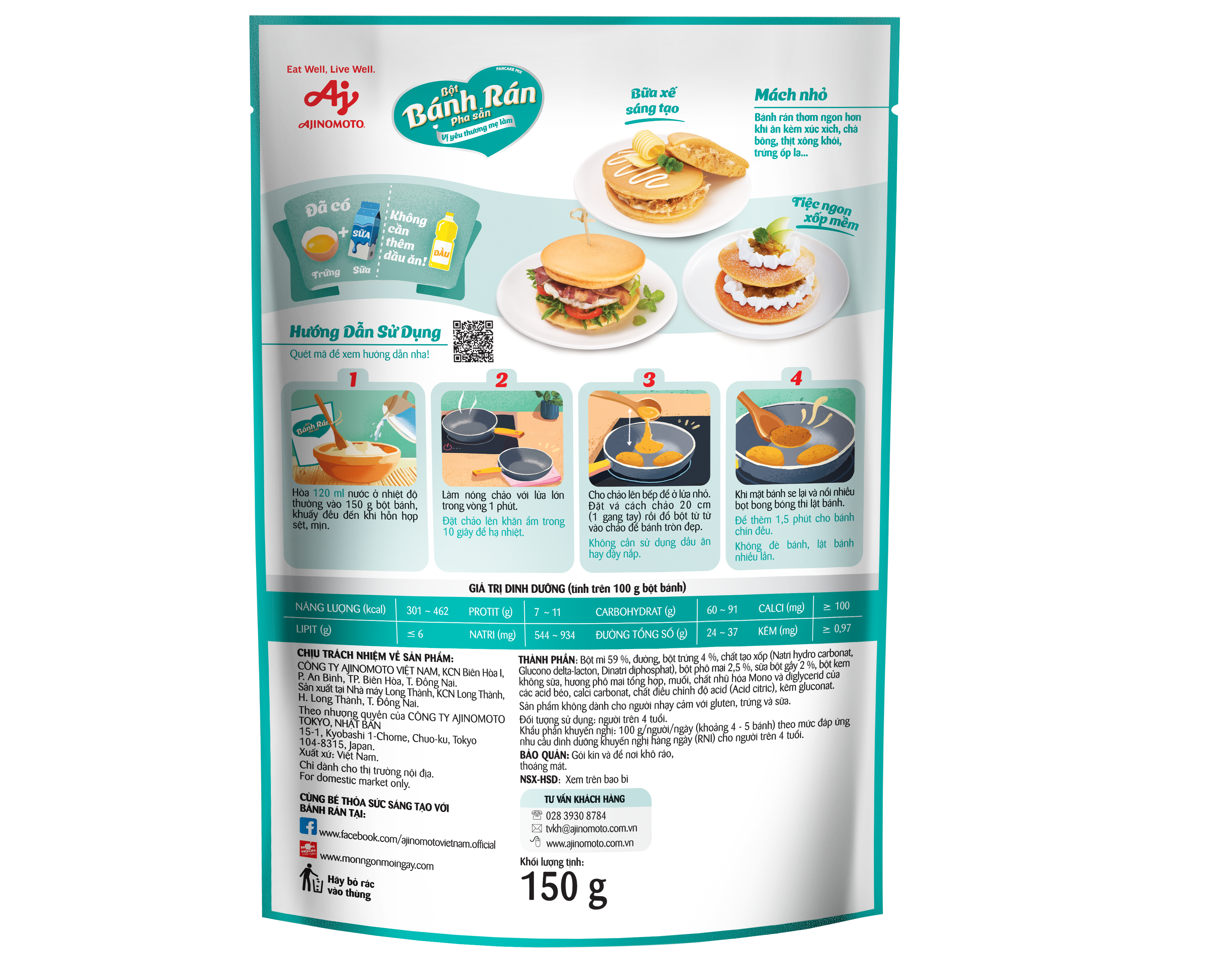 Combo 2 Gói Bột Bánh Rán Pha Sẵn - Vị Phô Mai Ajinomoto (150g/Gói) Bột bánh rán pha sẵn – vị phô mai, giải pháp làm mới thực đơn nhanh gọn cho cả gia đình! Sản phẩm cung cấp nguồn năng lượng phong phú từ phô mai, trứng, sữa và lúa mì; bổ sung Canxi và Kẽm - dưỡng chất hỗ trợ xương chắc khỏe và tăng cường hệ miễn dịch. Với tinh thần tiên phong mang đến cho người tiêu dùng sự tiện lợi cùng những trải nghiệm tự làm bánh rán tại nhà thật dễ dàng và ngon miệng. Chỉ cần thêm nước, 3 phút chế biến, kết hợp với nguyên liệu sẵn có, Mẹ có ngay những chiếc bánh rán mềm xốp, thơm ngon cho bữa sáng dinh dưỡng hợp vị cả nhà. Hướng dẫn sử dụng: 1> Hòa 105 ml nước vào 150 g bột bánh, khuấy đều đến khi hỗn hợp sệt, mịn. 2> Làm nóng chảo với lửa lớn trong vòng 1 phút. Đặt chảo lên khăn ẩm trong 10 giây để hạ nhiệt. 3> Cho chảo lên bếp để ở lửa nhỏ. Đặt vá cách chảo 20 cm (1 gang tay) rồi đổ bột từ từ vào chảo để bánh tròn đẹp. Không cần sử dụng dầu ăn hay đậy nắp. 4> Khi mặt bánh se lại và nổi nhiều bọt bong bóng thì lật bánh, để thêm 1,5 phút cho bánh chín đều. Không đè bánh, lật bánh nhiều lần.   Cách bảo quản: Để nơi khô ráo, thoáng mát. Xuất xứ: Việt Nam. Hạn sử dụng: 12 tháng kể từ ngày sản xuất.   Thông tin thương hiệu Được thành lập từ năm 1991, Công ty Ajinomoto Việt Nam là công ty 100% vốn đầu tư nước ngoài thuộc Tập đoàn Ajinomoto, Nhật Bản. Công ty Ajinomoto Việt Nam luôn nỗ lực không ngừng trong việc nghiên cứu phát triển để mang đến nhiều chủng loại sản phẩm thực phẩm và gia vị với chất lượng tốt nhất, an toàn, phù hợp với khẩu vị của người Việt. Bên cạnh đó, chúng tôi luôn mong muốn đóng góp vào sự phát triển của nền văn hóa ẩm thực đặc sắc của Việt Nam qua việc tư vấn, giới thiệu những hương vị mới và cách thưởng thức món ăn mới cho người Việt, mang lại những bữa ăn ngon và hạnh phúc cho mọi gia đình.