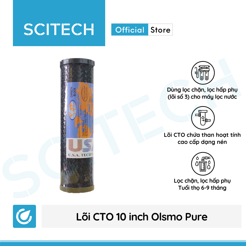 Lõi CTO 10 inch Olsmo Pure xuất xứ Malaysia sử dụng vật liệu than hoạt tính gáo dừa tự nhiên cao cấp dạng nén (than hoạt tính được xay nhỏ sau đó ép bằng máy thủy lực thành dạng hình trụ và bọc màng lưới bên ngoài). Lõi CTO giúp hấp phụ độc tố, màu, mùi, chất hữu cơ…; đồng thời lọc sạch các tạp chất cặn bẩn, cát, các vật trôi nổi và lơ lửng trong nước nhờ kích thước rất nhỏ, chỉ 5 micron giữa các hạt. Ngoài ra, lõi CTO còn giúp bảo vệ và tăng tuổi thọ các lõi phía sau như màng RO (trong máy lọc nước RO) hay lõi Aragon (trong máy lọc nước Nano).