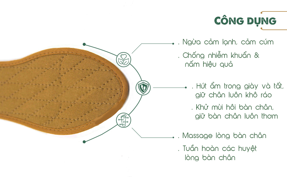 CÔNG DỤNG CỦA LÓT GIÀY QUẾ VẢI COTTON CI-03 Được làm từ nguyên liệu Quế Trà My nên có rất nhiều công dụng như: - Diệt nấm, vi khuẩn tồn tại trong giày.